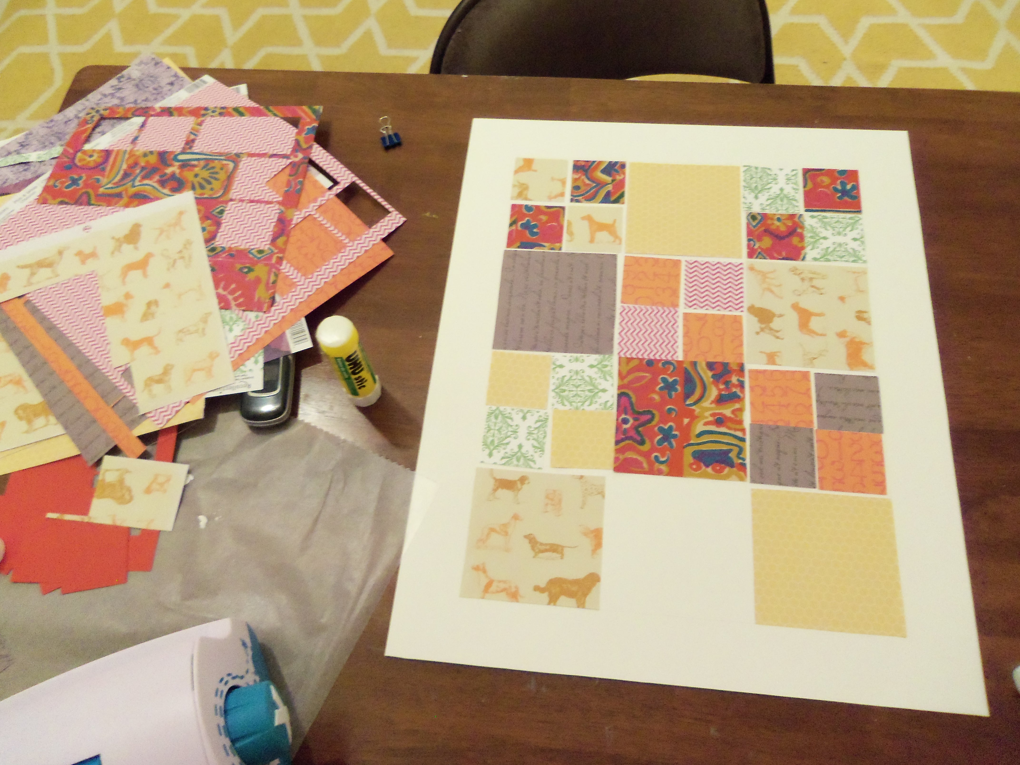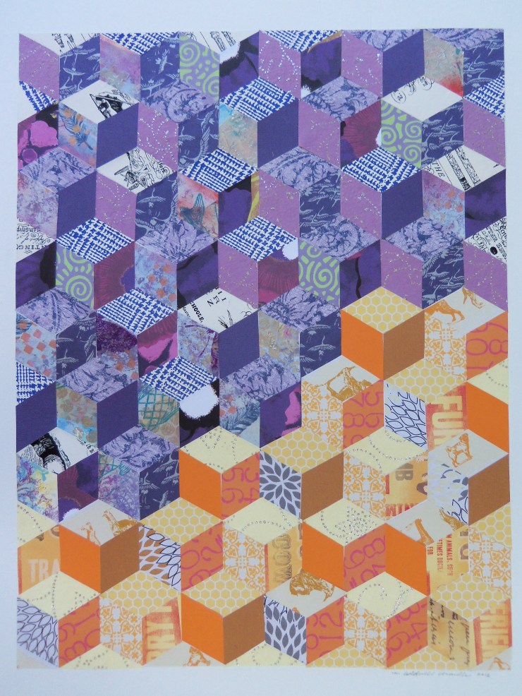 This is my favorite piece from this week’s work.  It took me longer to cut the hundreds of tiny diamonds than it took me to assemble the pieces, but I find the tedious work therapeutic.  I will continue pursuing these “paper quilts” next week as well.