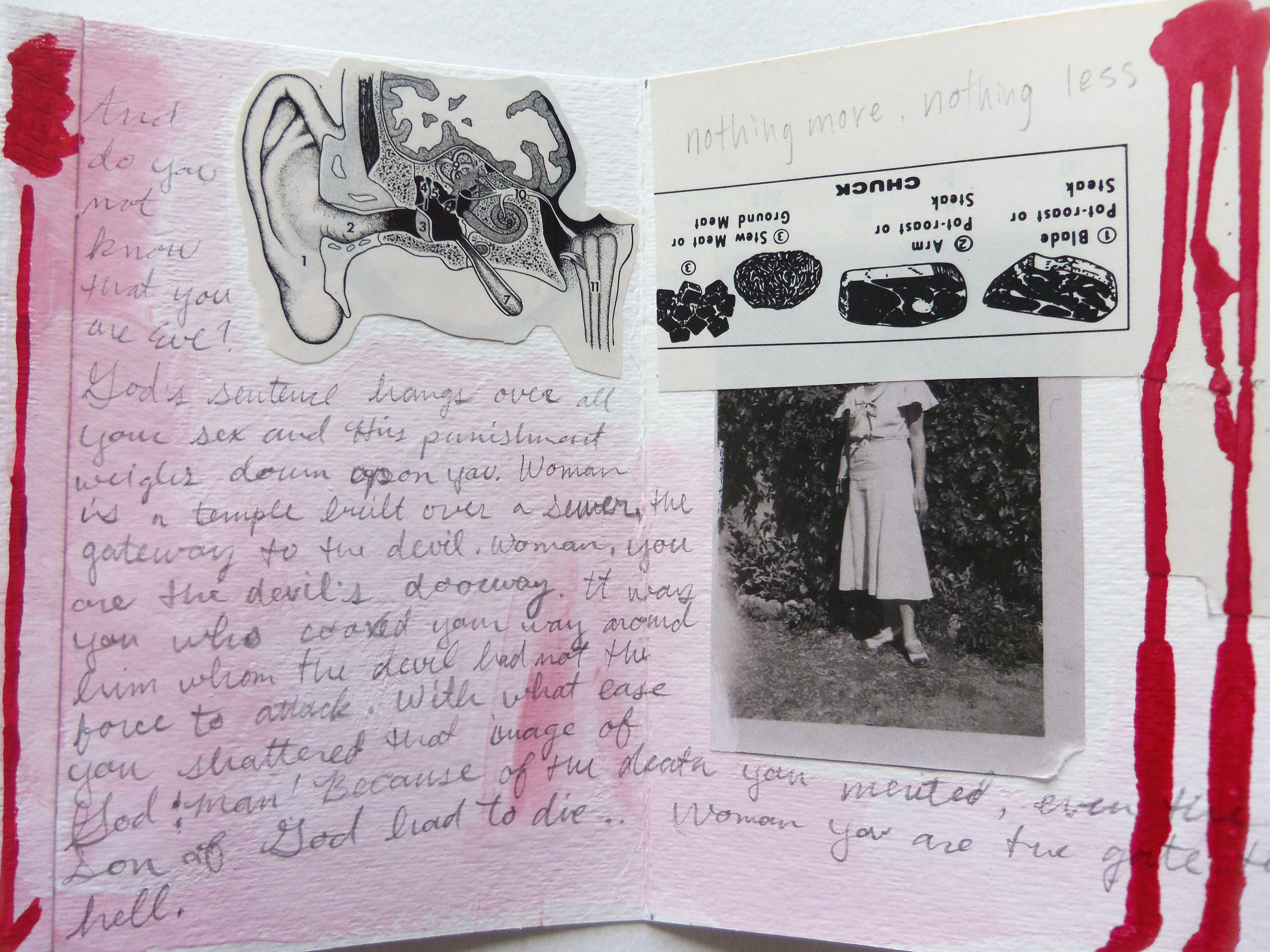 I had never heard of this phrase helpmeet until a couple weeks ago. Once I discovered it, I was seeing it everywhere. I couldn’t get the phrase out of my head, so I made this book. I followed the same method I used last week. (Click here to read about it!) I chose one of my many boxes of scraps and I went to it. When these new scraps were sorted, there emerged a dainty red/pink theme. The box also contained some scraps with images of cuts of beef. Kismet, again?!
