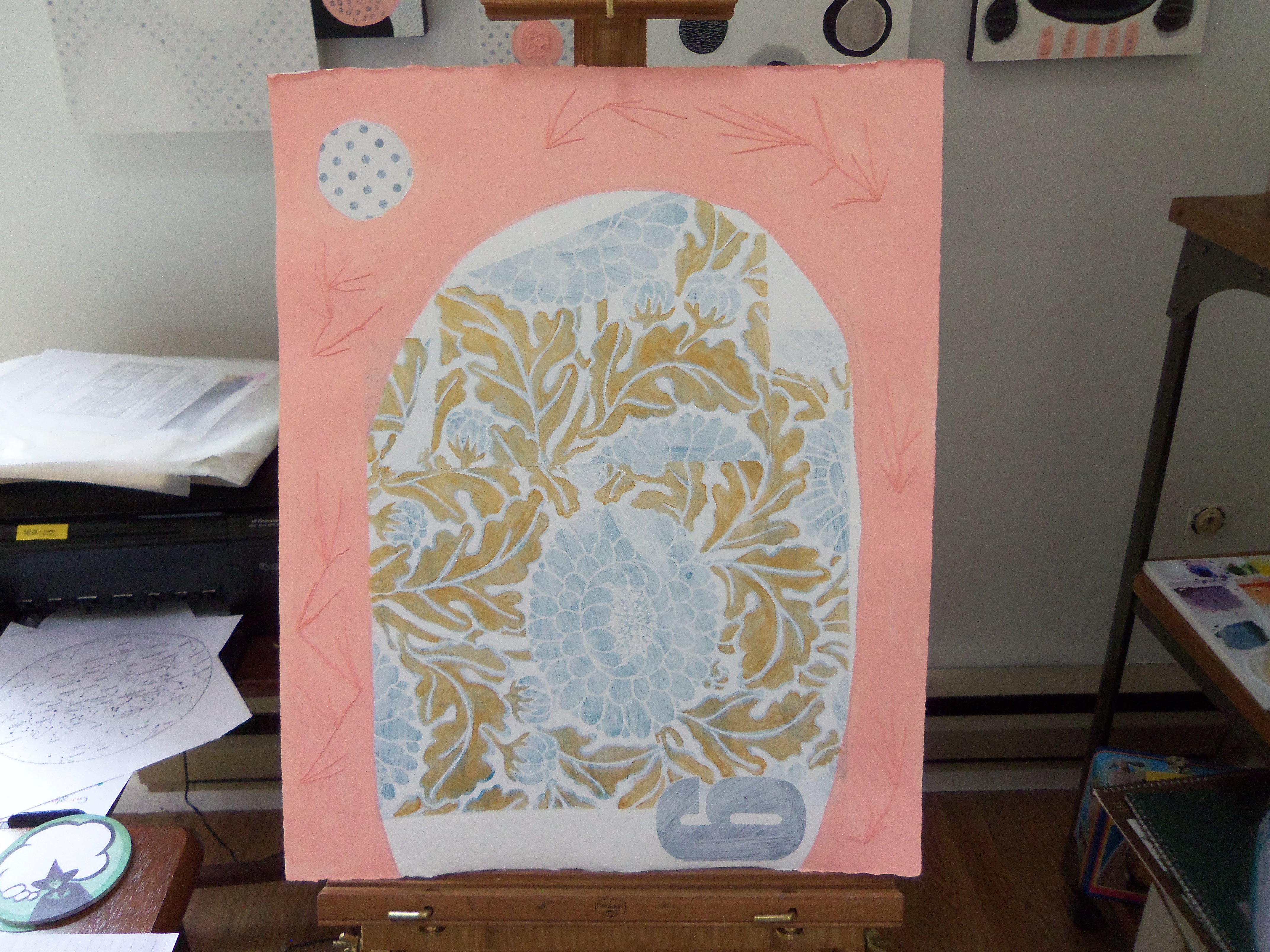 I’ve hit a bit of an impasse with my substrates.  I’m torn between creating works on paper or works on wood panel.  They each have pros and cons.  On one hand, the birch panels are great because they’re heavy, substantial, and they do not require framing.  On the other hand, they are much more expensive than paper, are harder to store, and they limit my use of materials in that I can’t easily pierce through their surface.  The only way to use embroidery floss on panel is to “glue” it onto the surface. With paper, I can actually sew through the surface, which makes for a really nice effect.  Paper is also more cost efficient and can be easily stored away in a portfolio.  On the down side, paper can easily wrinkle, it’s hella expensive to frame, and there’s also the issue of conservation.