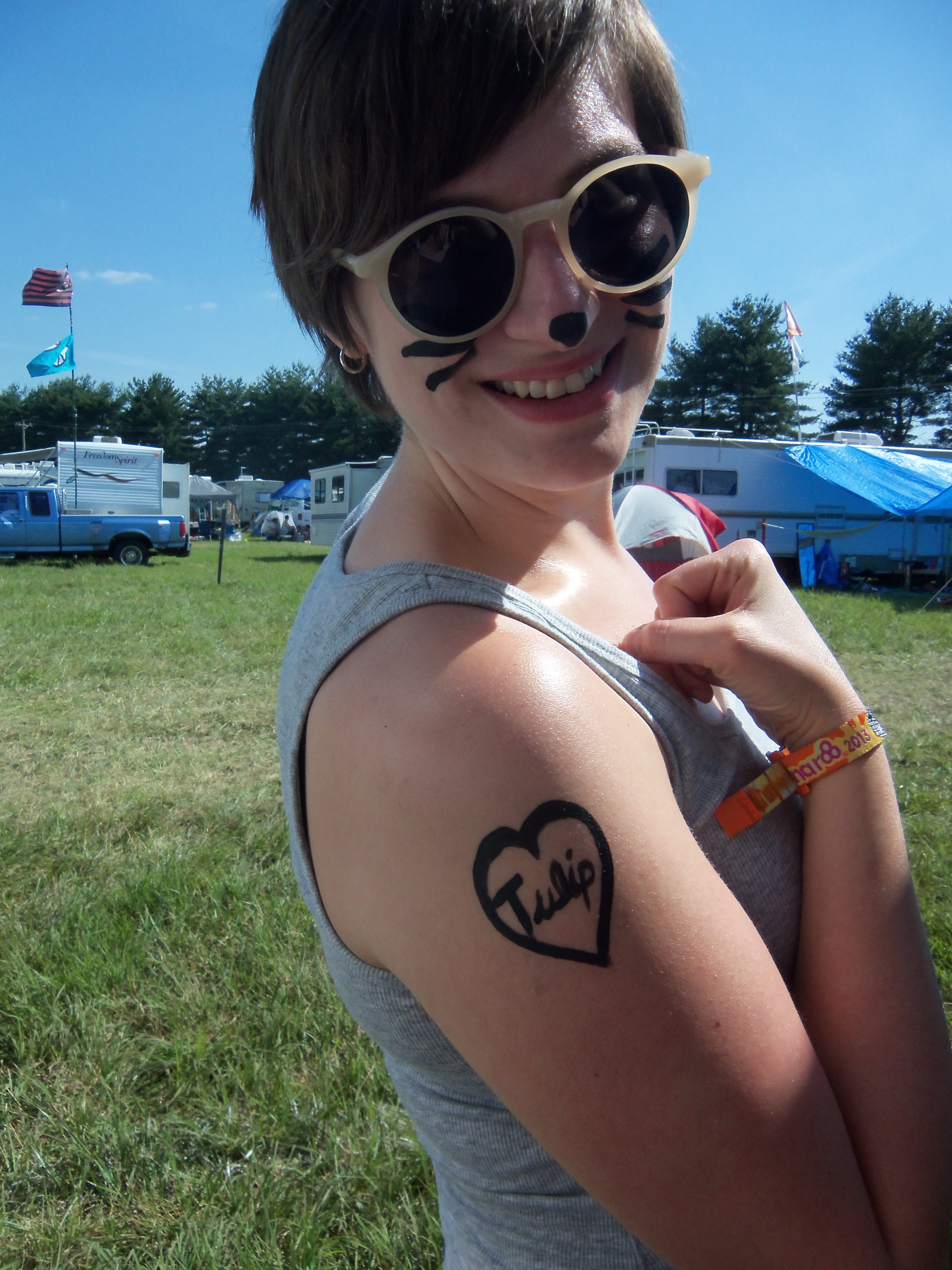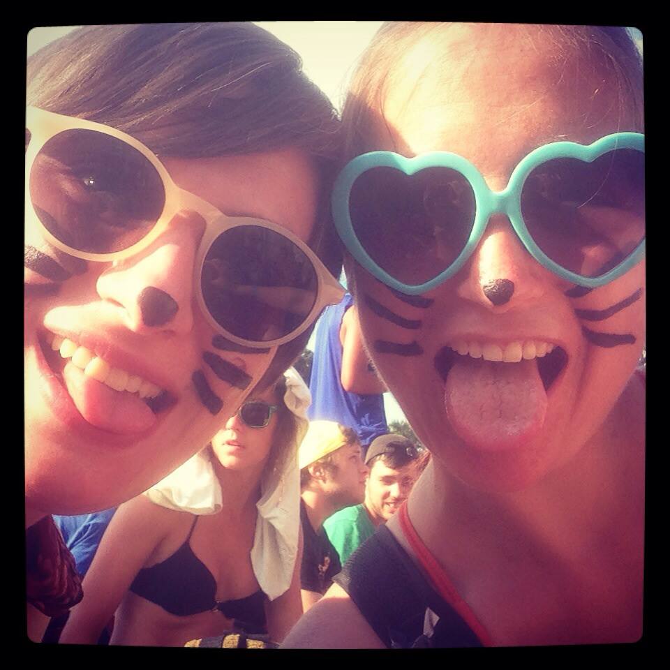 Saturday at Bonnaroo was a tired sort of day.  My first show was Cat Power.  I went with Kris, and we painted our faces as kitty cats for the show.  We also paid homage to our dearly departed kitties with heart tattoos on our biceps (Kris’s cat, Sam E. once sent her to the emergency room.  I didn’t get to hear the whole story, but I’m thoroughly intrigued.)  I was really looking forward to Cat Power’s show, but I have to admit it was a very strange and stilted performance.  I’m afraid Cat Power’s past demons of drugs and alcohol had a lot to do with it.  Cat Power’s voice is still amazing, however, and Kris and I will continue to support her.