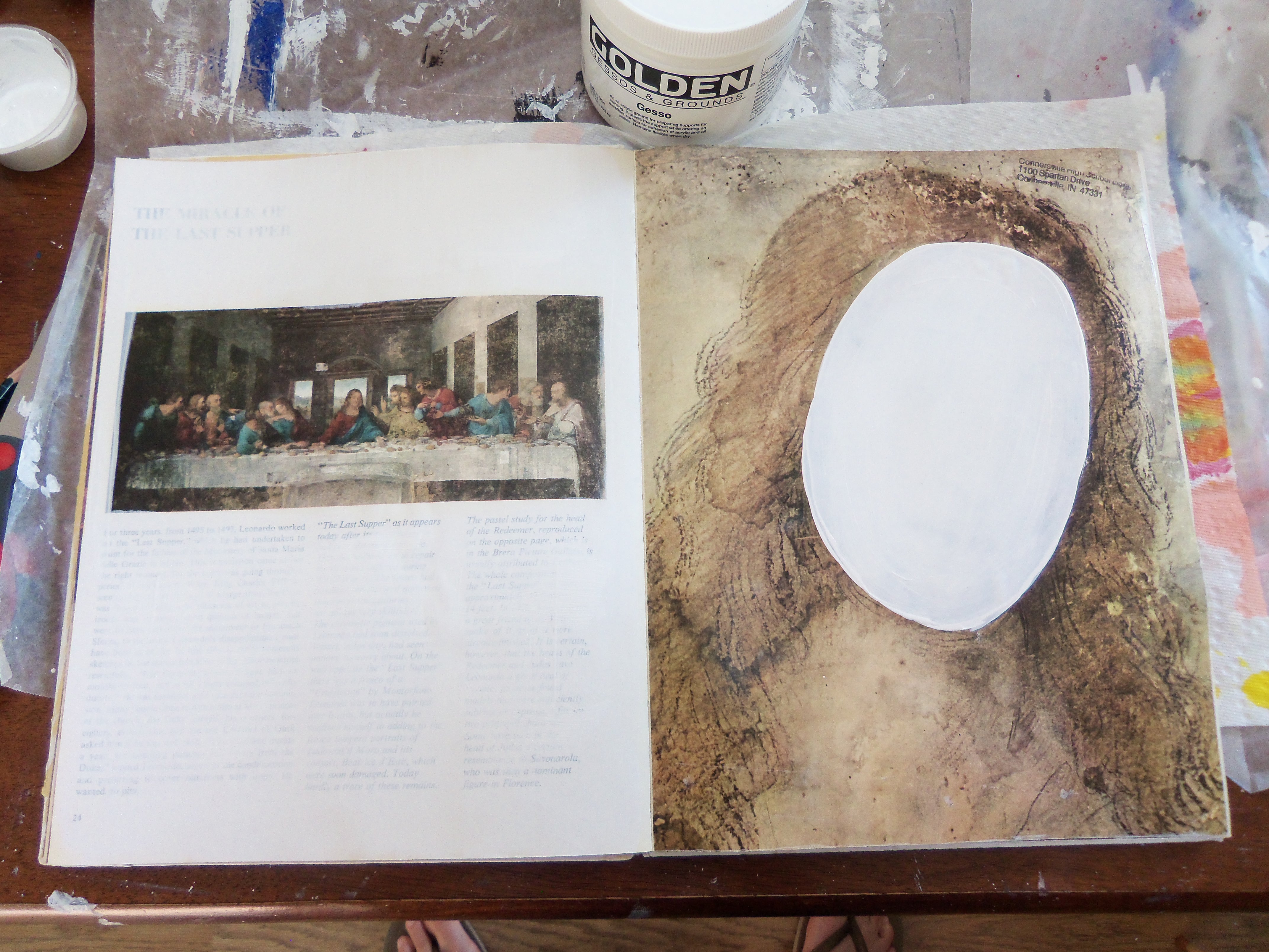 To help organize my thoughts during this Holes series, I’ve also started an altered book to experiment with new ideas. For those who don’t know, an altered book is any book (old, new, recycled) that is painted, glued, cut, pierced, drawn, drilled, collaged, etc., to change (aka alter) its original form. This book will serve as an alternative sketchbook, and hopefully it will help alleviate some of my anxiety with the larger paintings. With any luck, when this book is finished it will also be a stand-alone work of art. (Big thanks to my mom, who spotted this book in the discard pile at the high school library where she works! She has an eye for what I like, and she’s always bringing me discarded goodies.)