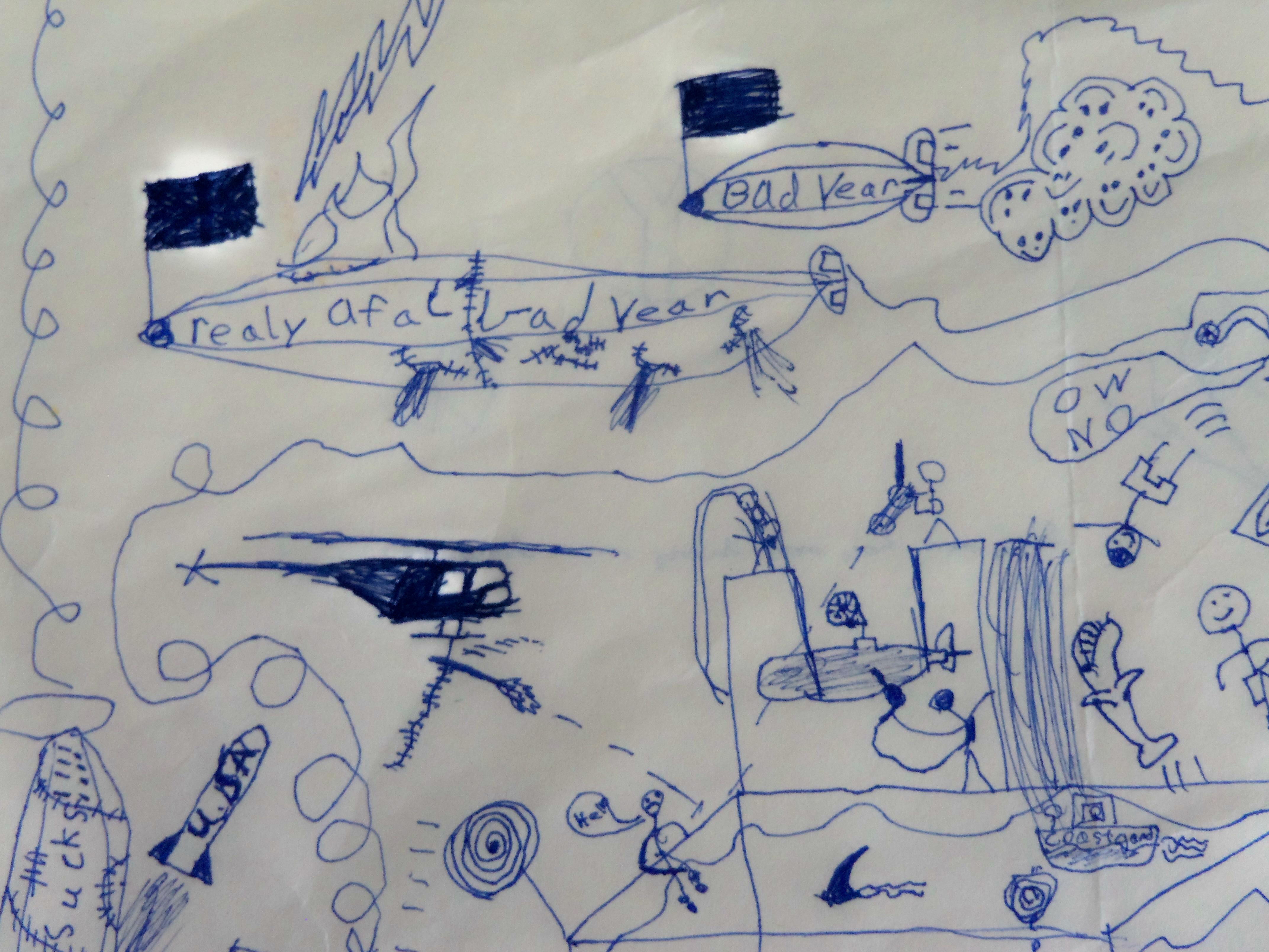 Something I find interesting about the drawing is that I can’t easily discern which parts Travis drew and which parts I drew.  Our mark-making is very similar.  The only way I can differentiate between our drawings is the subject matter.  I liked drawing people and animals, and Brother liked drawing guns and other military apparatus.  You can see my handy work with the buck toothed cat, man with giant tongue eating a lollipop, peace loving alien, people walking “like an Egyptian,” body builder, pelican drinking some kind of potion, as well as the long-armed yodeler.  Travis’s creative genius can be seen in the gun crazy Abe Lincoln, the Gatling guns, atomic bomb explosions, helicopter, a tiny truck running over a man’s leg, and a man and woman riding a crashing airplane in what I can only assume is a loving tribute to Stanley Kubrick.