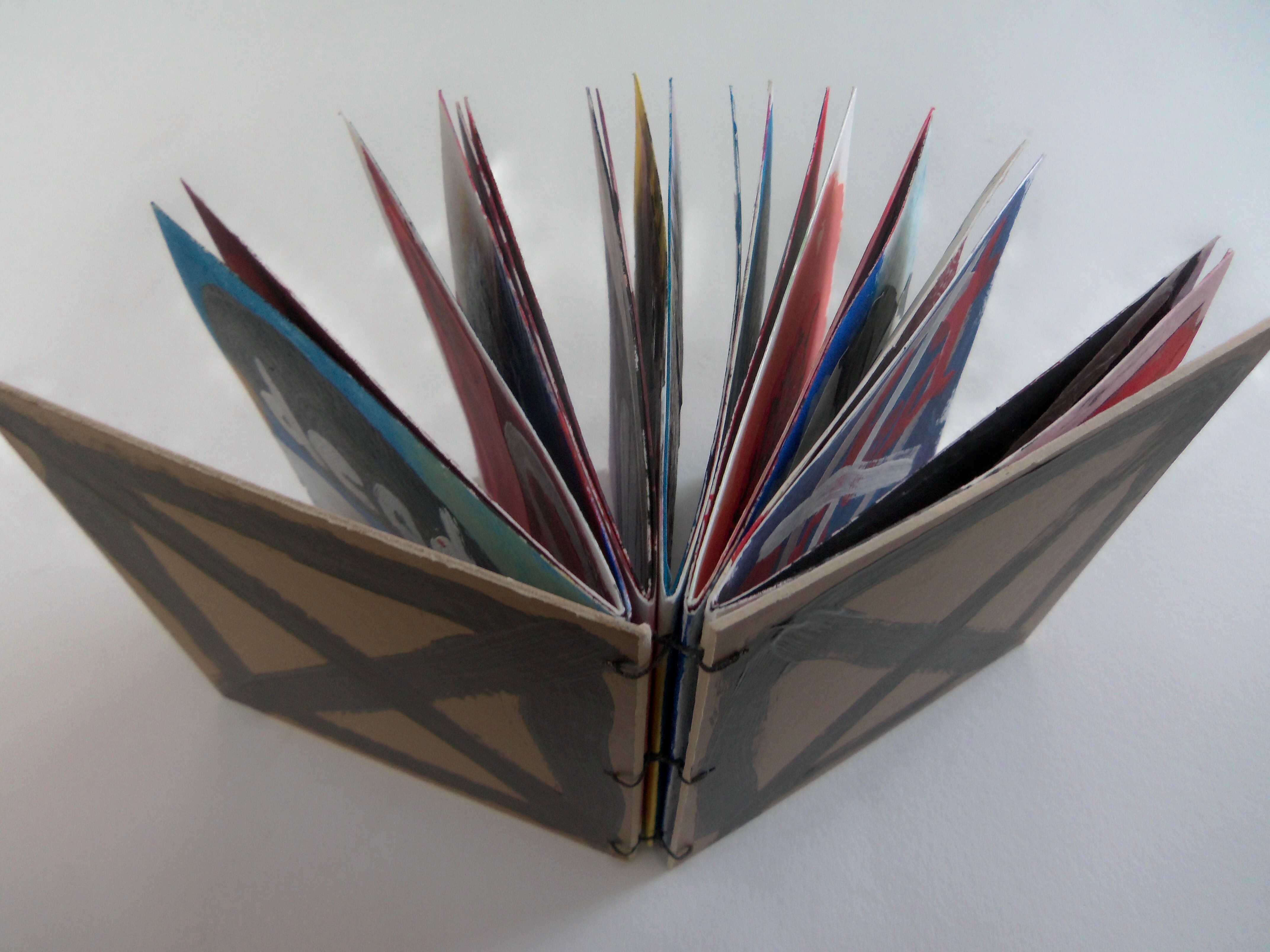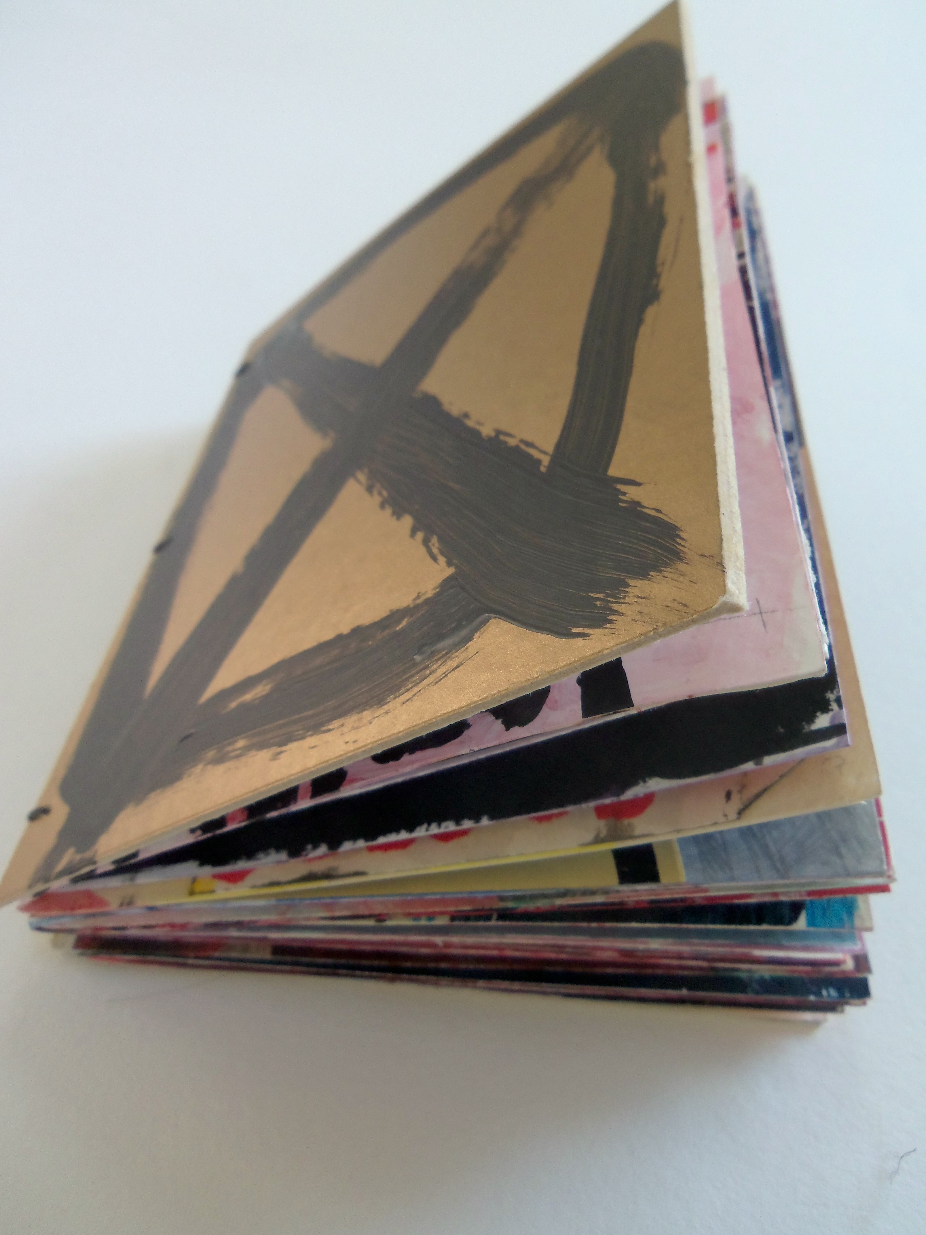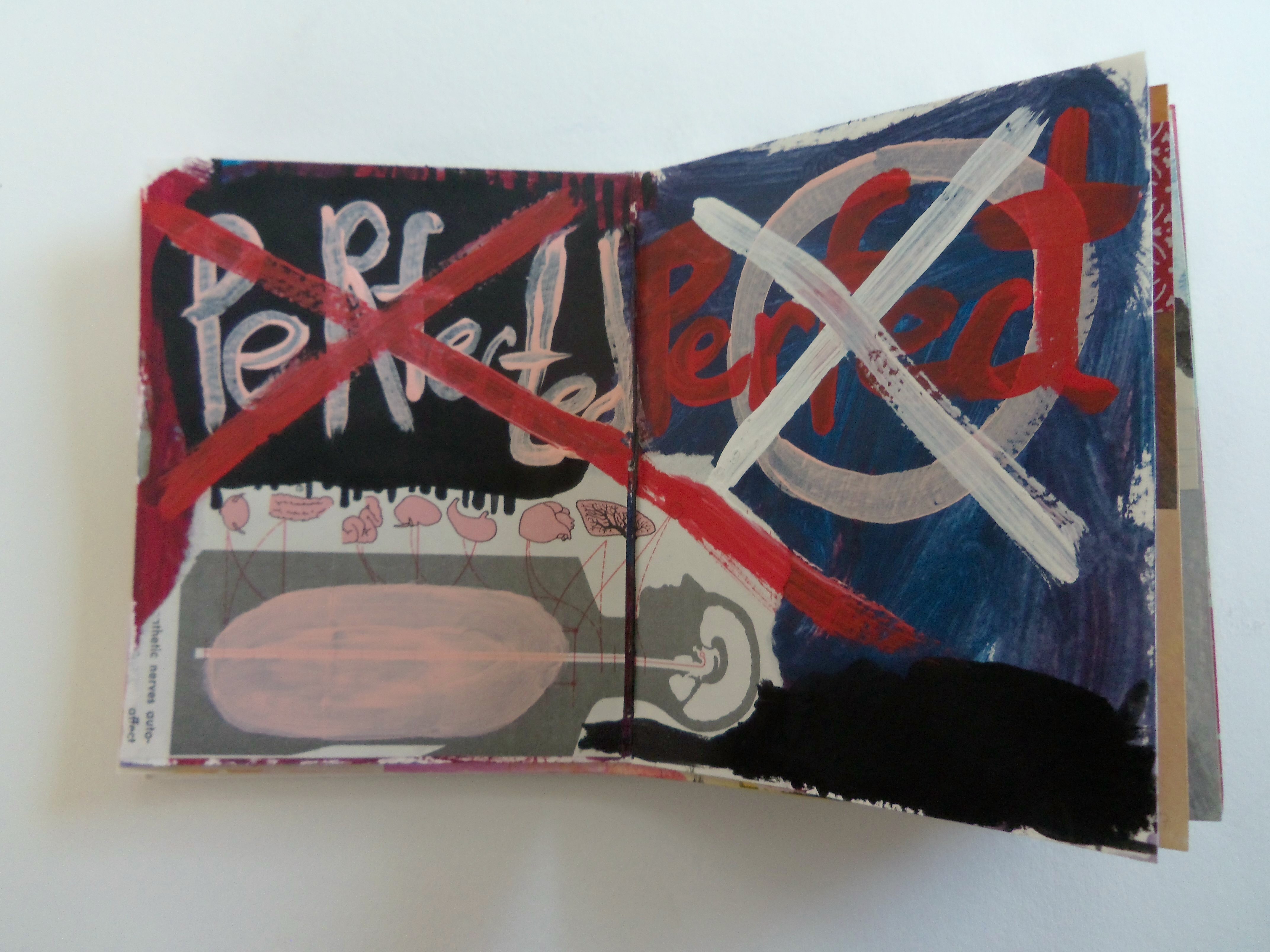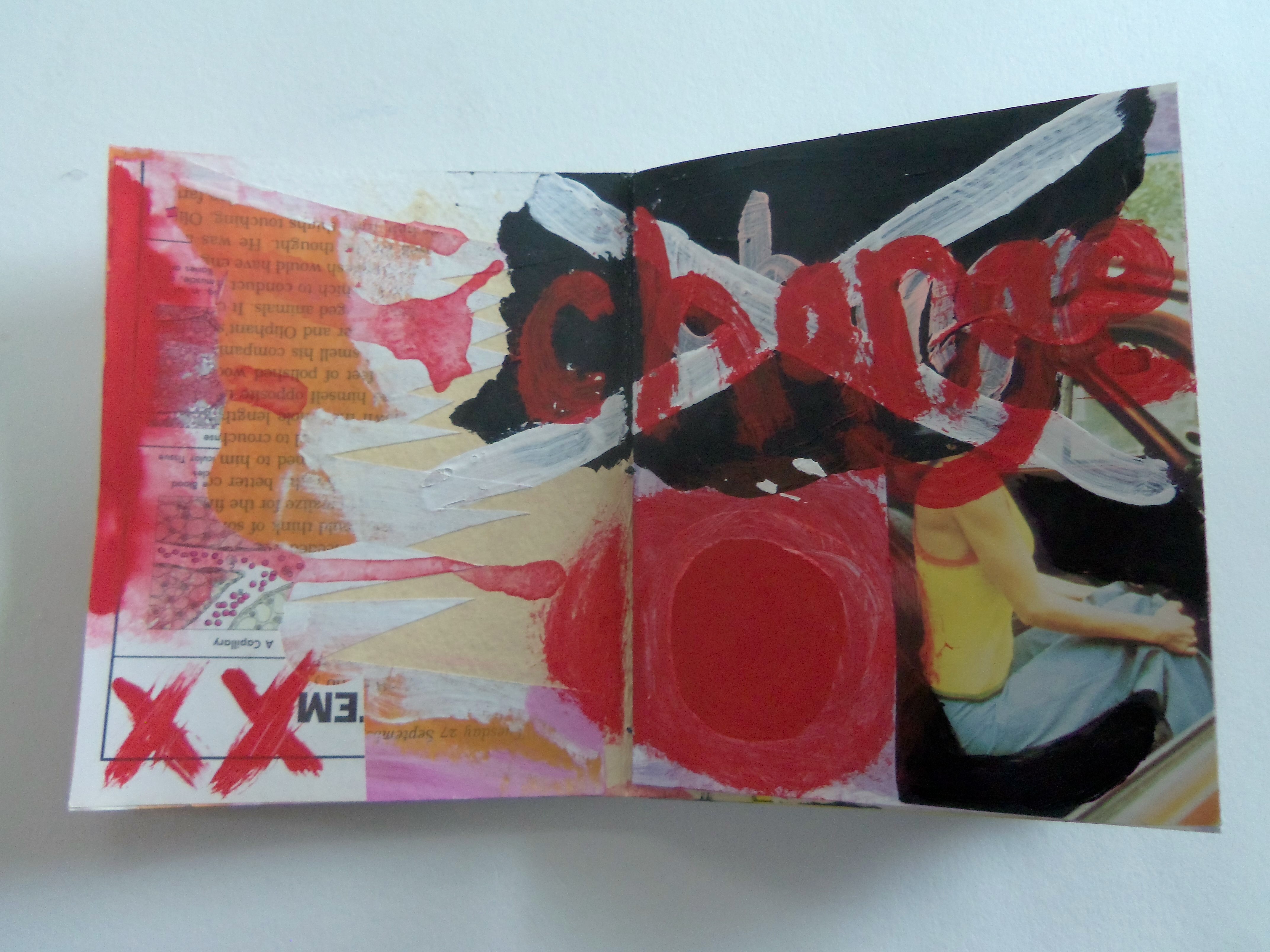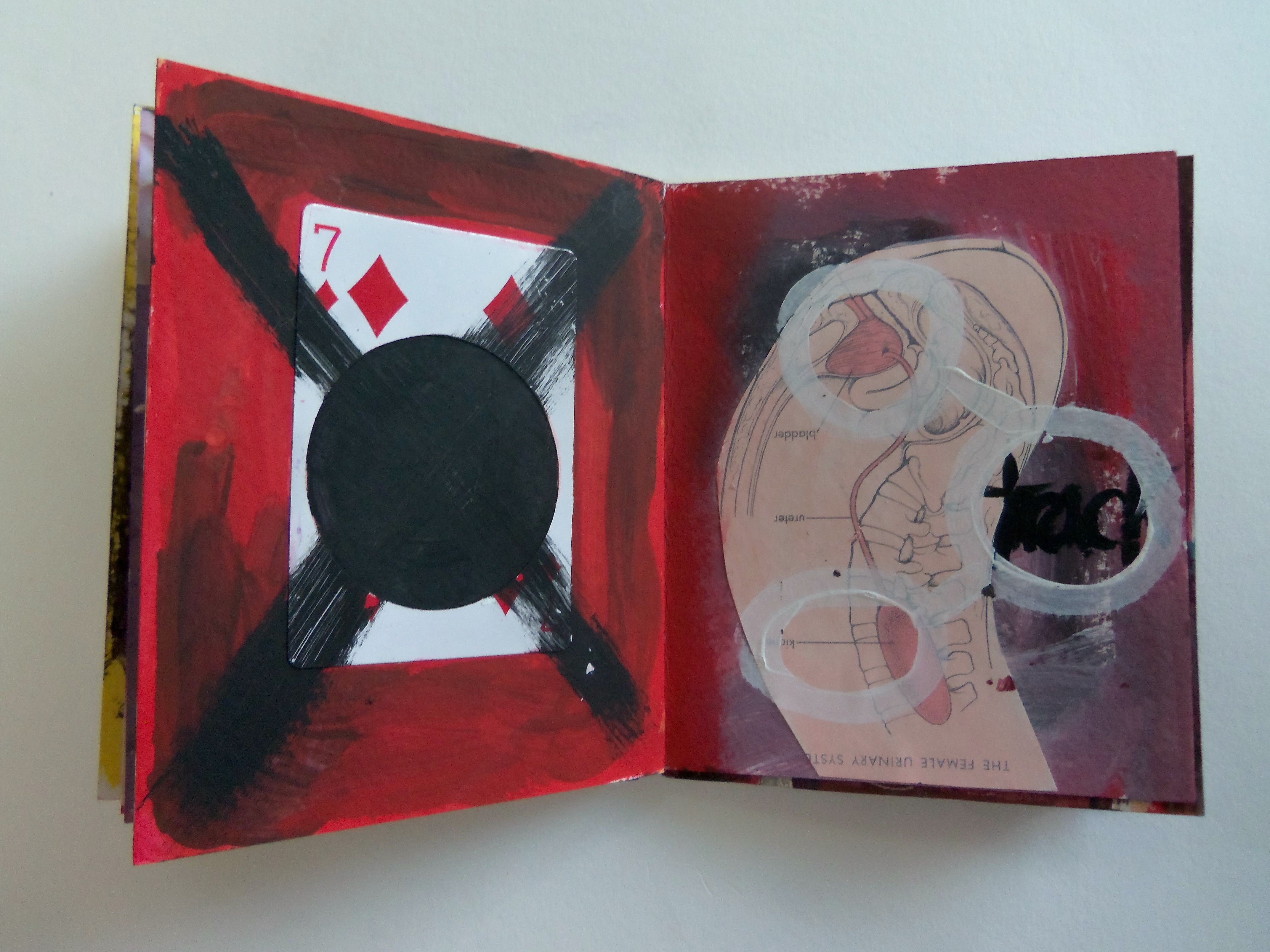 Obsess Manifest, 4.75″x5.75″x1″, Mixed media artist’s book with chain stich binding, 2013