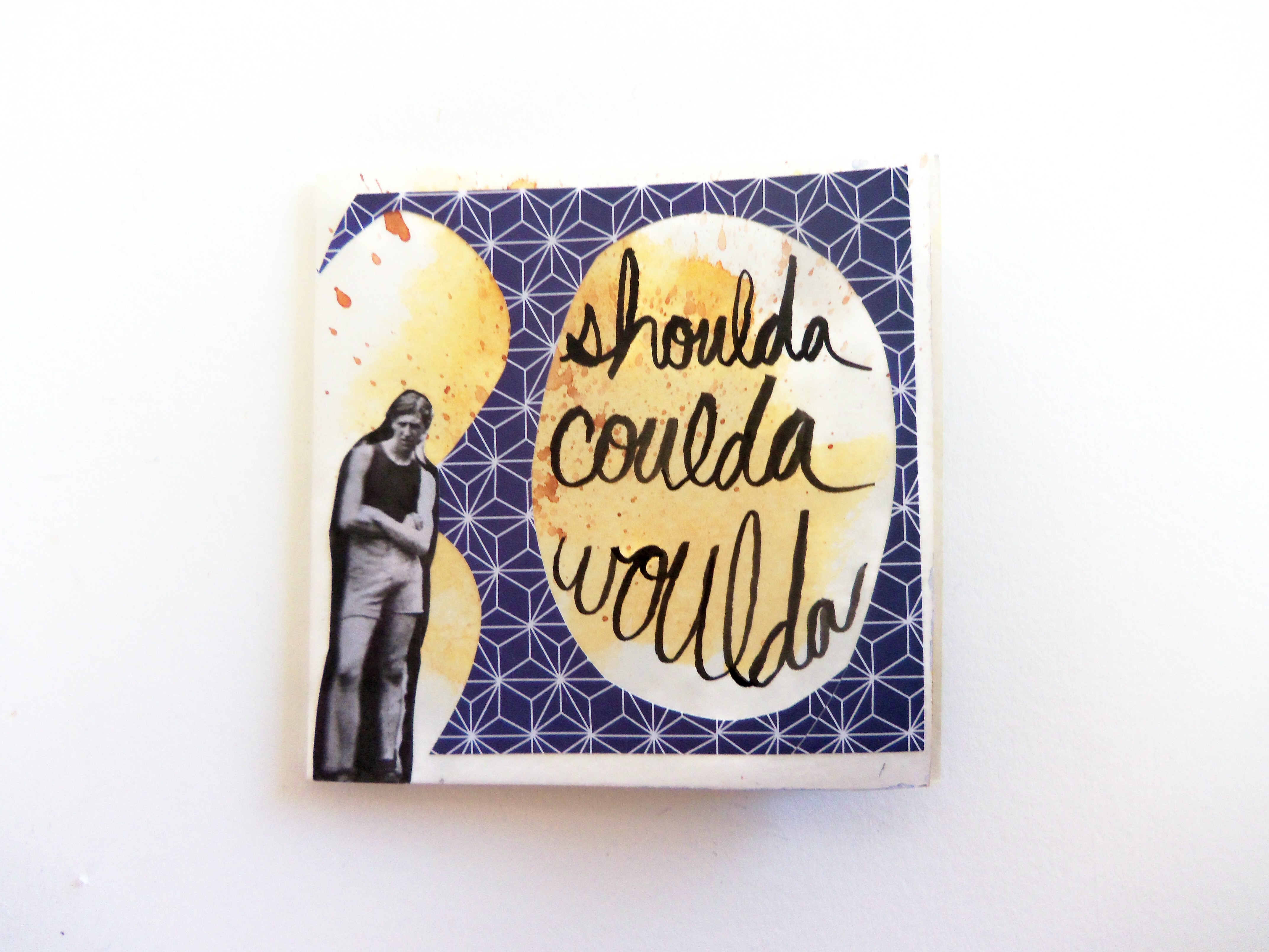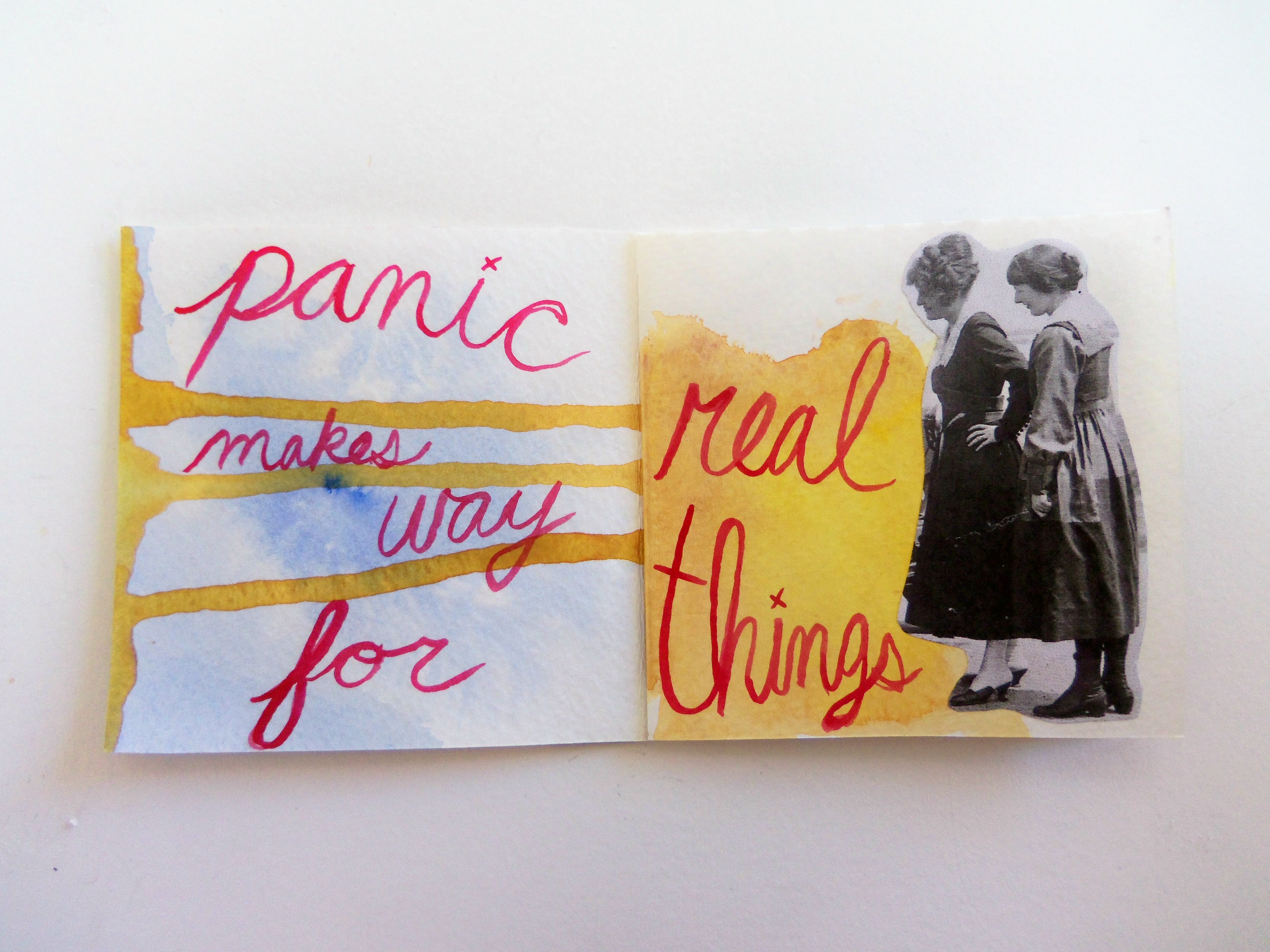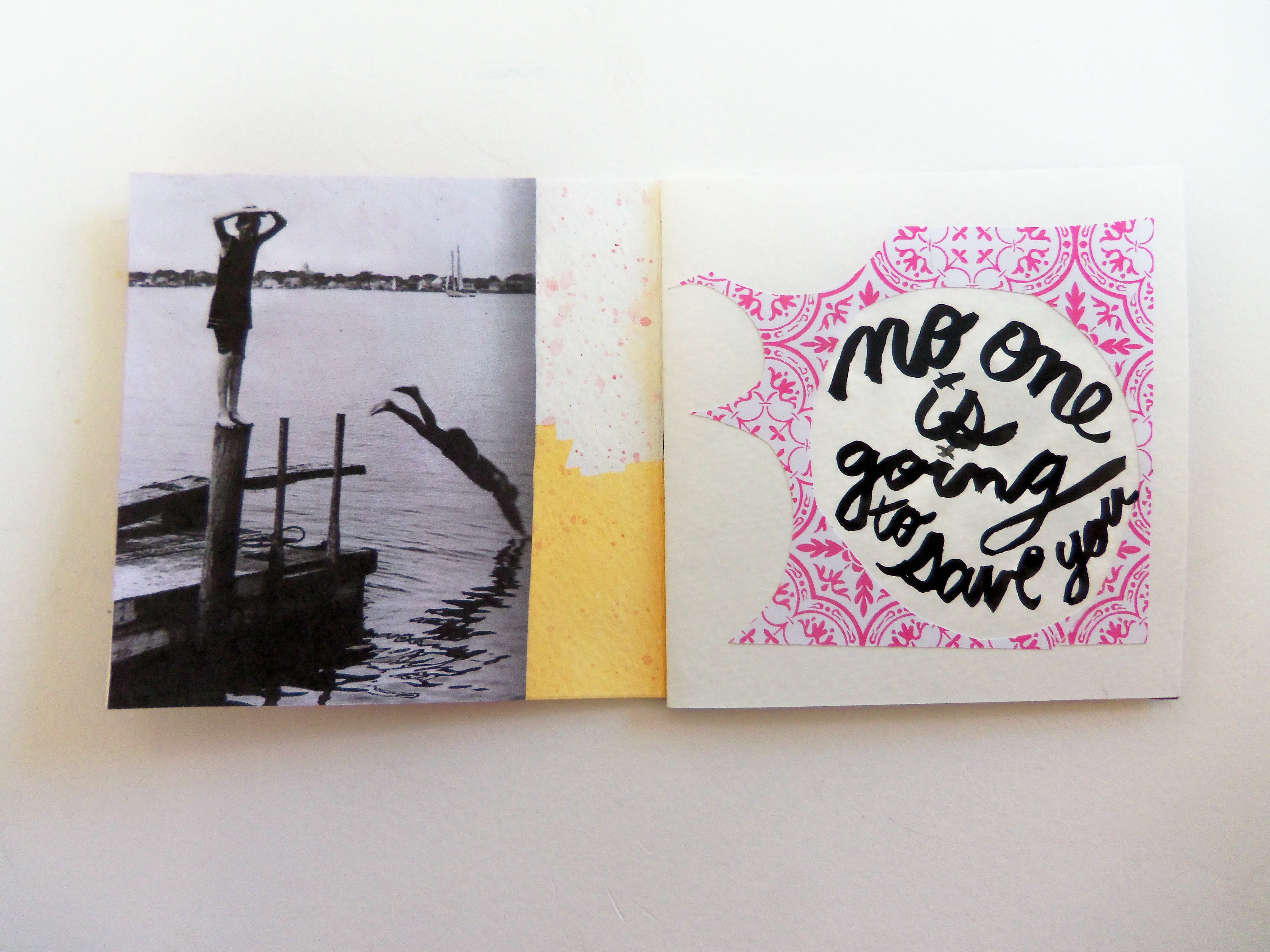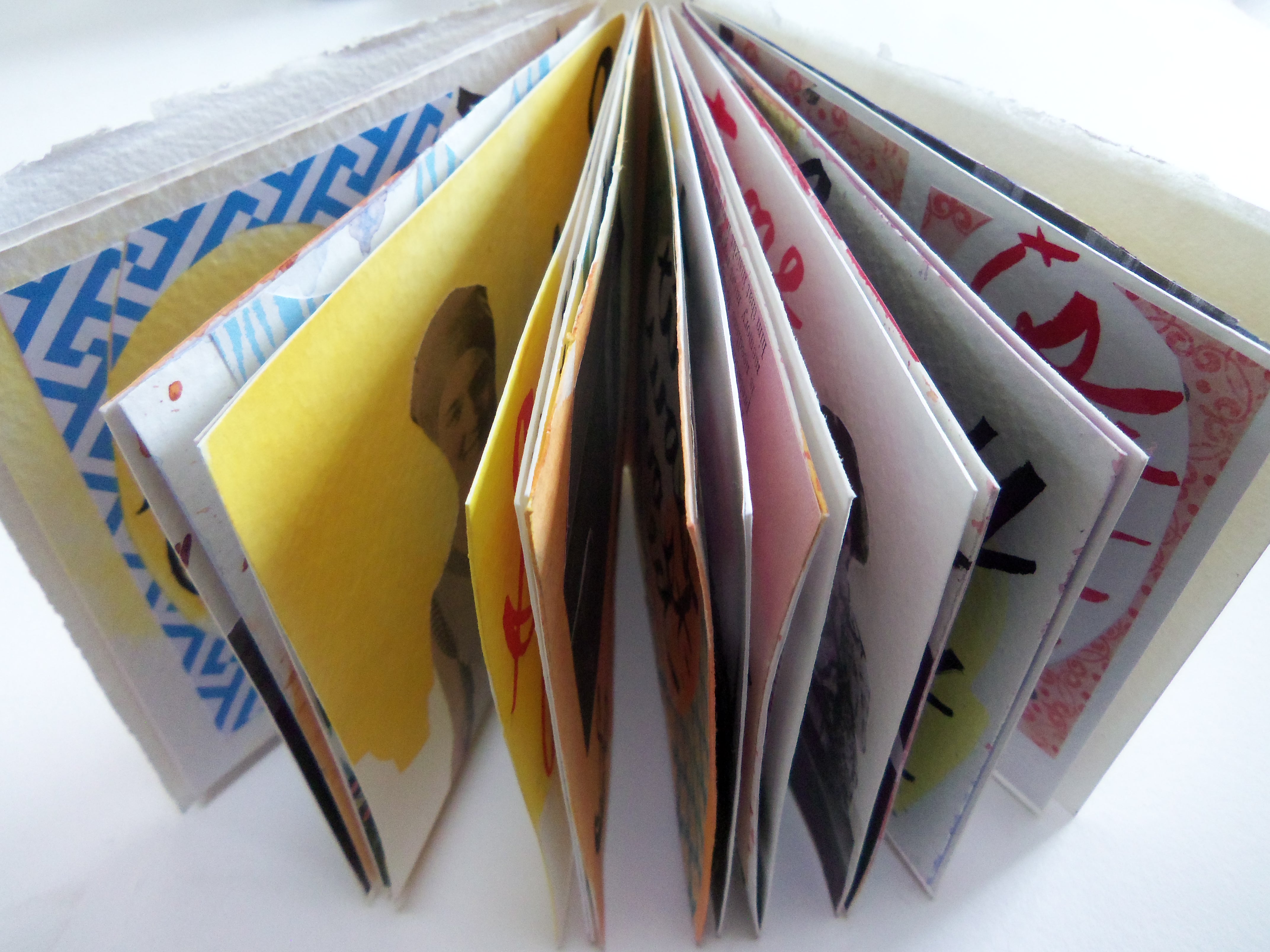 Oh, Hello, 4.75×4.75, Handmade Book with Exposed Stitch Binding, Watercolor, Acrylic Ink, Decorative Paper, Collage, Hemp Cord, 2014