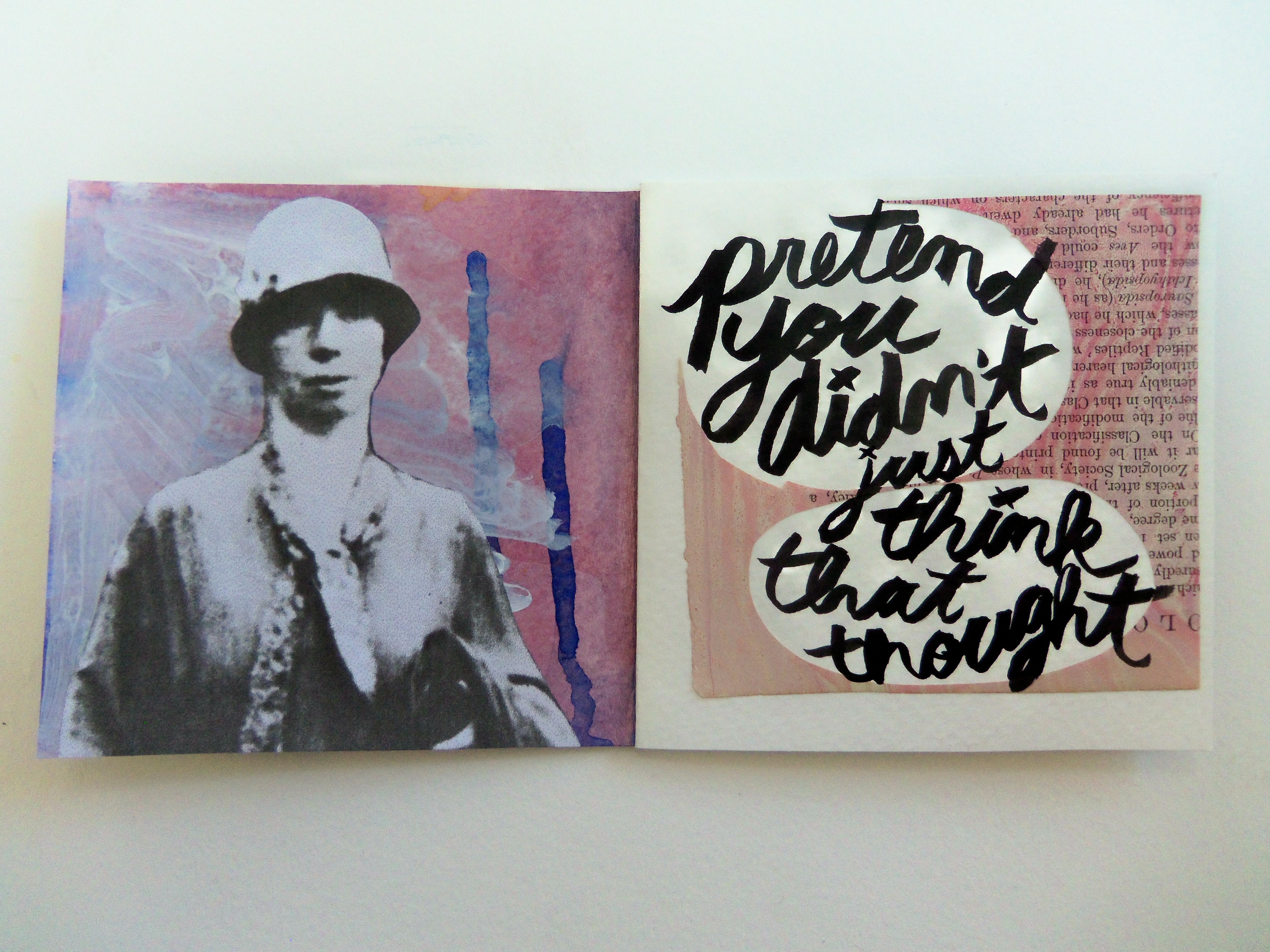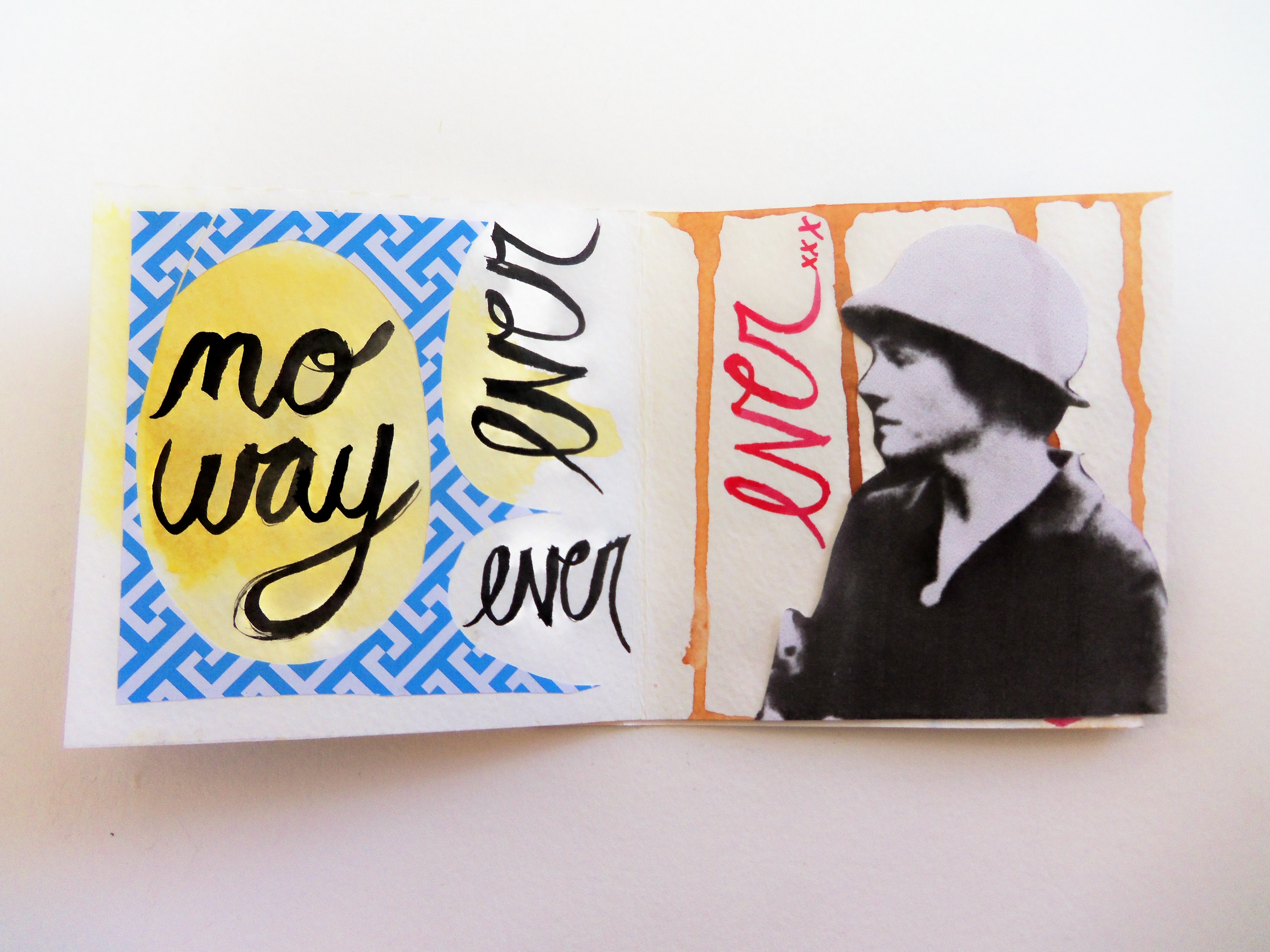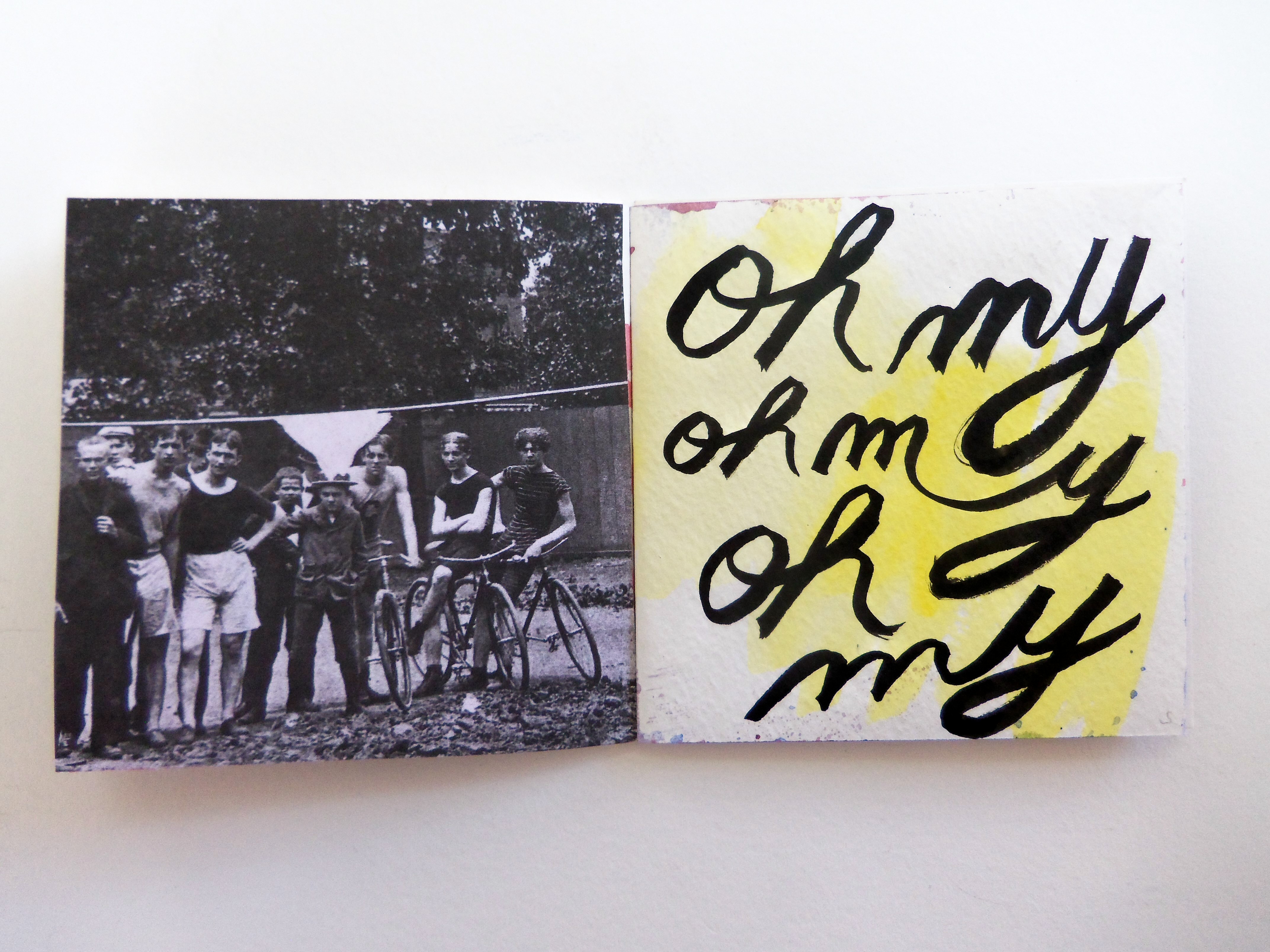 I have a new book completed this week, and it’s titled Oh, Hello.  Lately I’ve been enjoying practicing my cursive writing with ink and a paintbrush.  I like the way it looks, and it makes me feel like I’m back in third grade.  I think some of the pages in this book look great; others I think are just so-so.