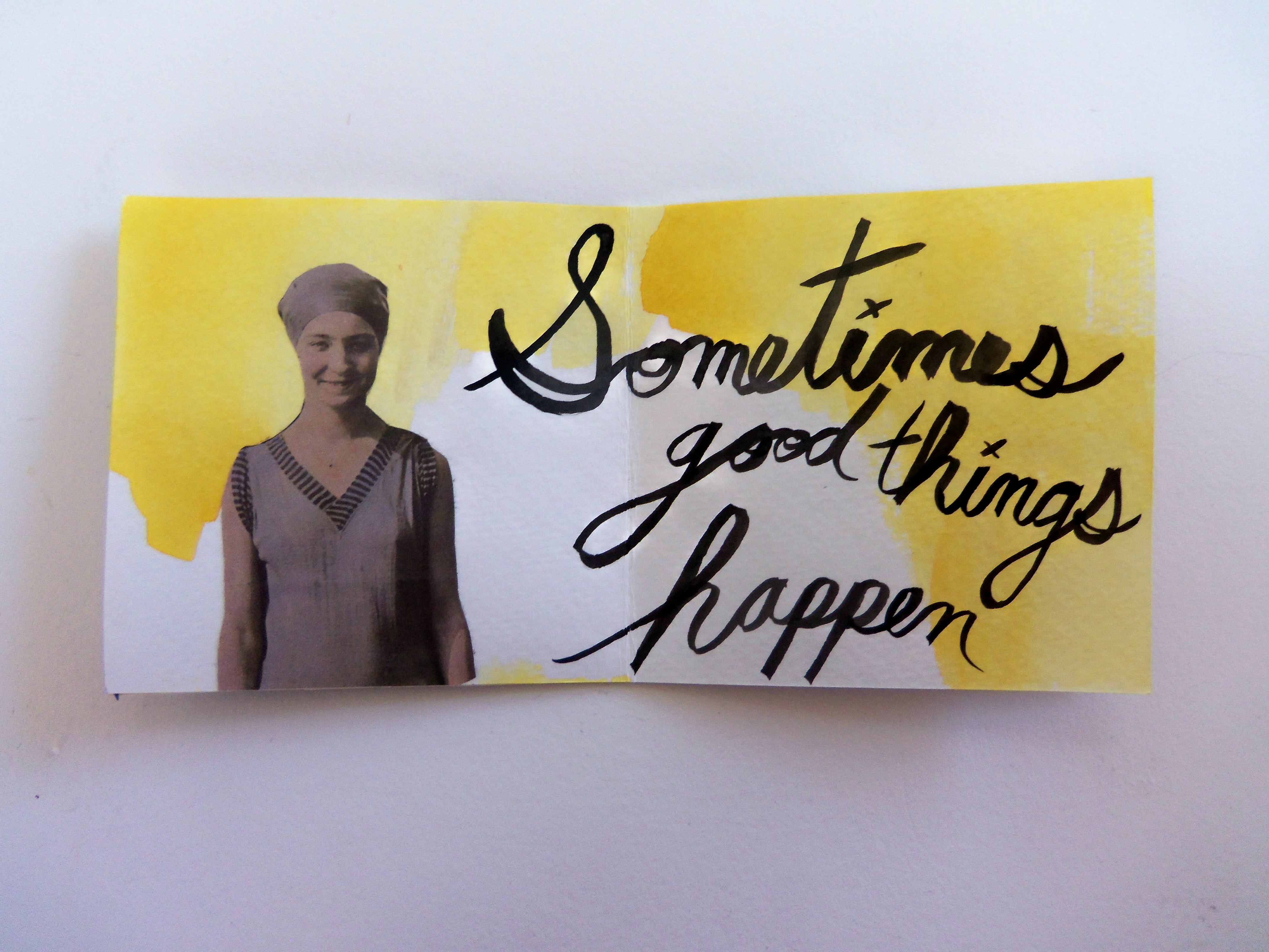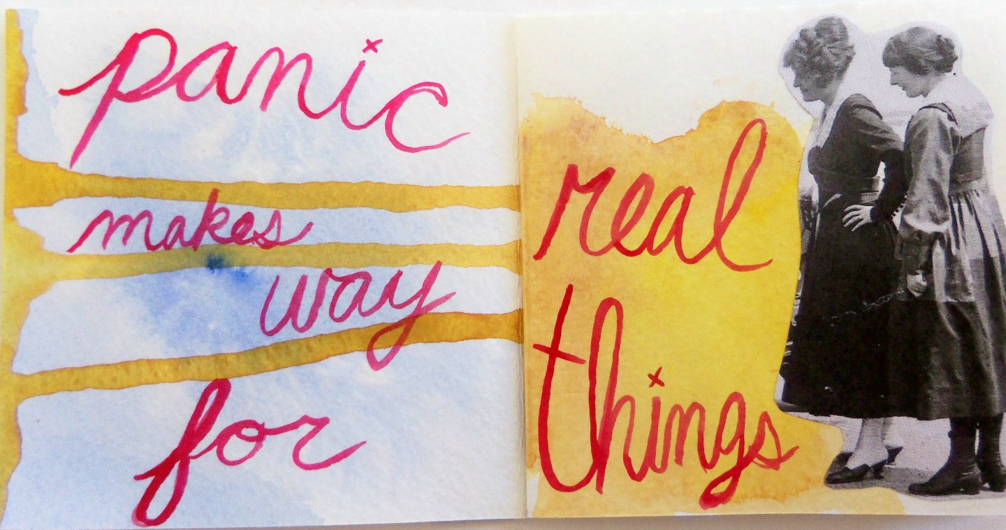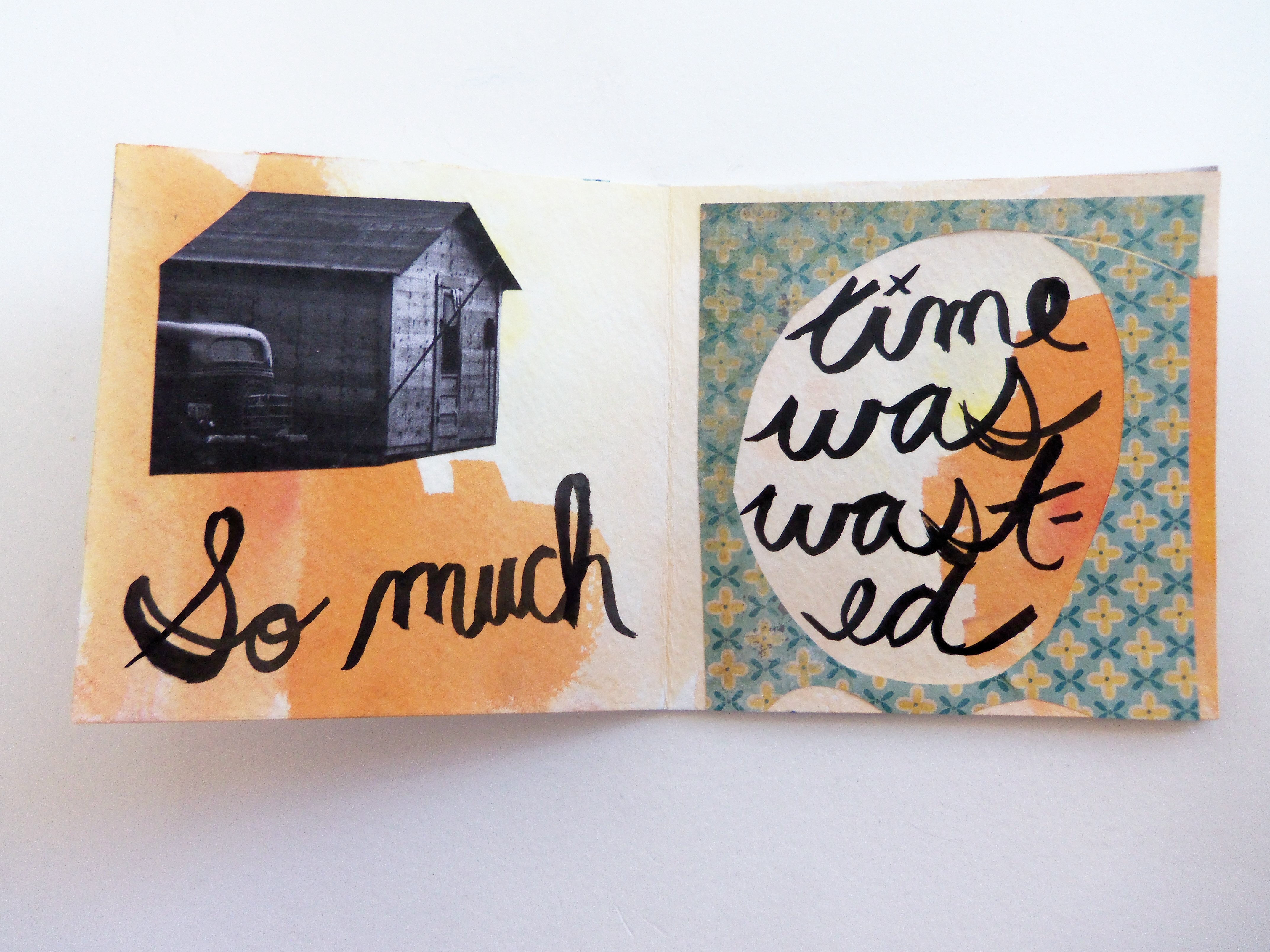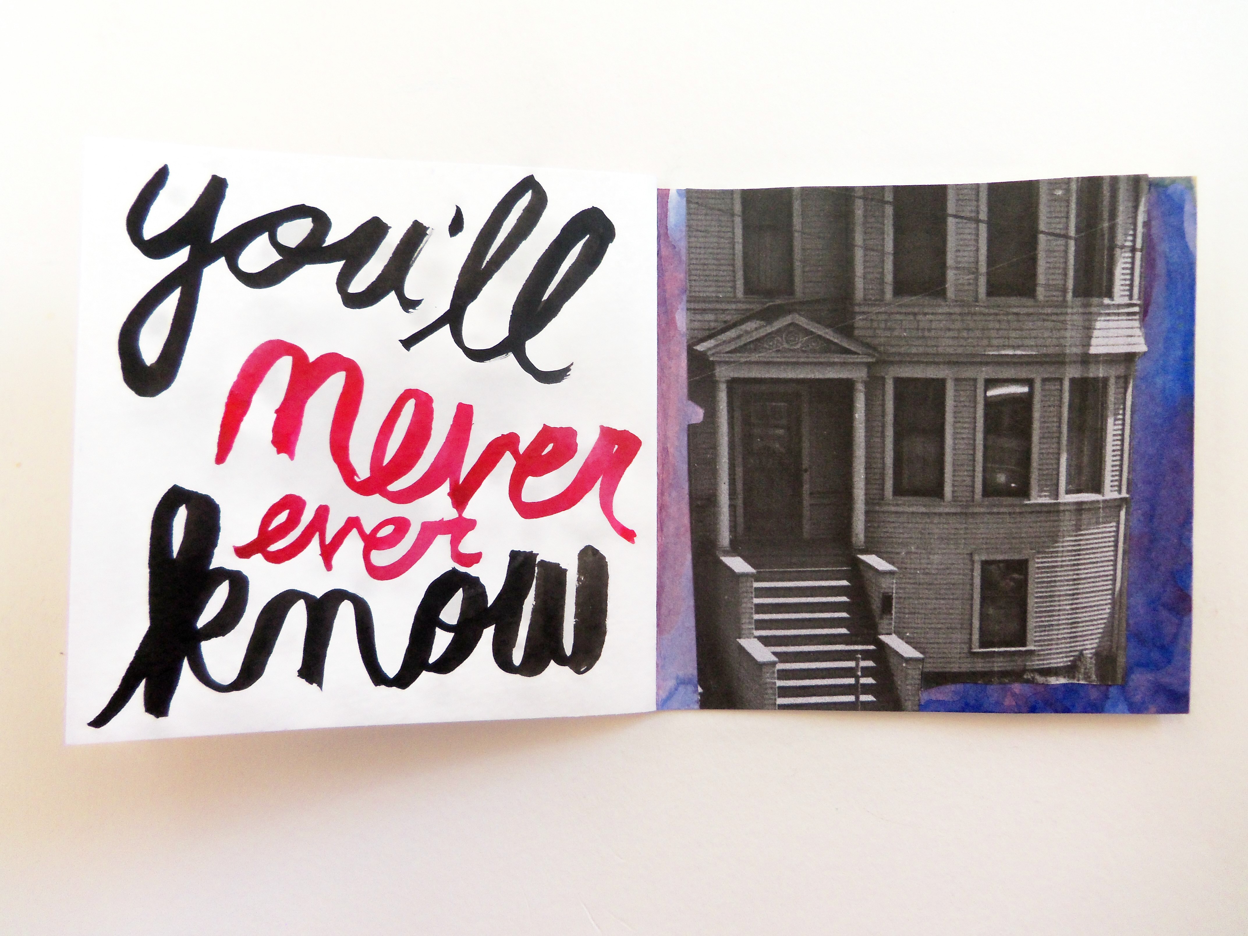 I have a new book completed this week, and it’s titled Oh, Hello.  Lately I’ve been enjoying practicing my cursive writing with ink and a paintbrush.  I like the way it looks, and it makes me feel like I’m back in third grade.  I think some of the pages in this book look great; others I think are just so-so.
