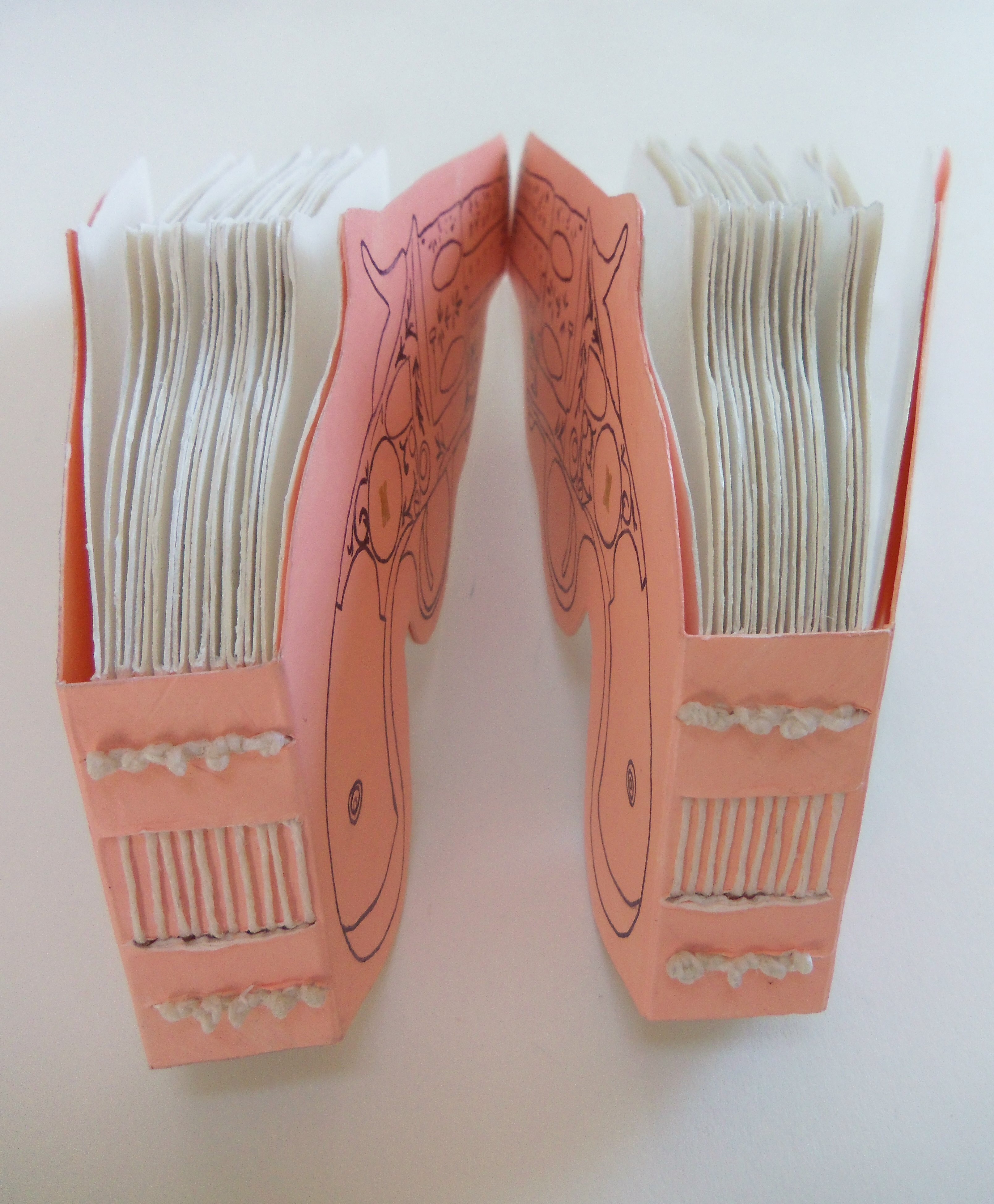 The most time consuming aspect of this project was cutting the pages. I originally wanted to use a lighter-weight drawing paper, but I quickly realized that would mean I’d have to cut approximately 100 pages. I decided to use a heavier watercolor paper, which reduced my cutting to only 20 pages, but the thick paper made the work hard on my hands. After I had all the pages and covers cut and painted, I created the designs for the covers. I traced the designs in pencil, and then I retraced them with a Sharpie marker. This should have been easy, but I had forgotten that Sharpies don’t work well on top of acrylic paint. I ended up having to clean off the Sharpie tip every few seconds, which made for tedious work. Finally, I bound the pages to the cover with an exposed stitch binding.