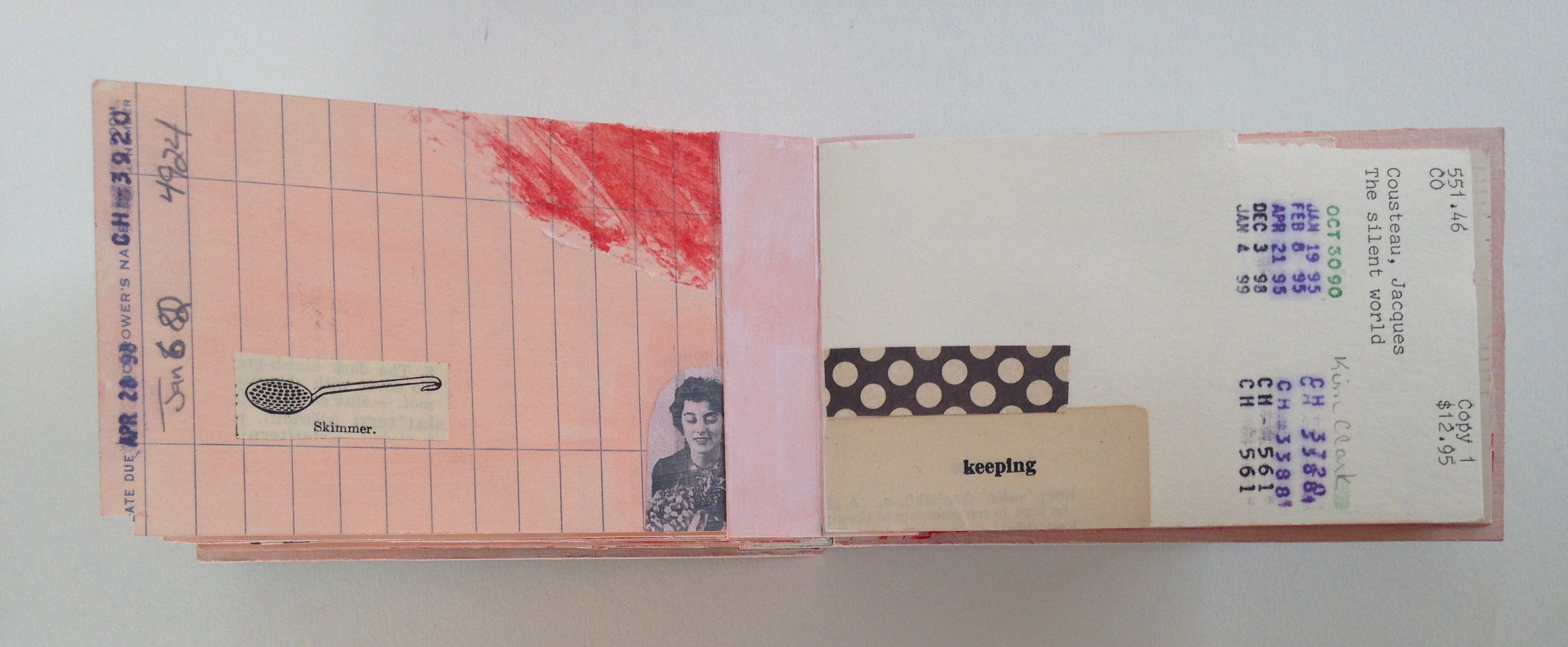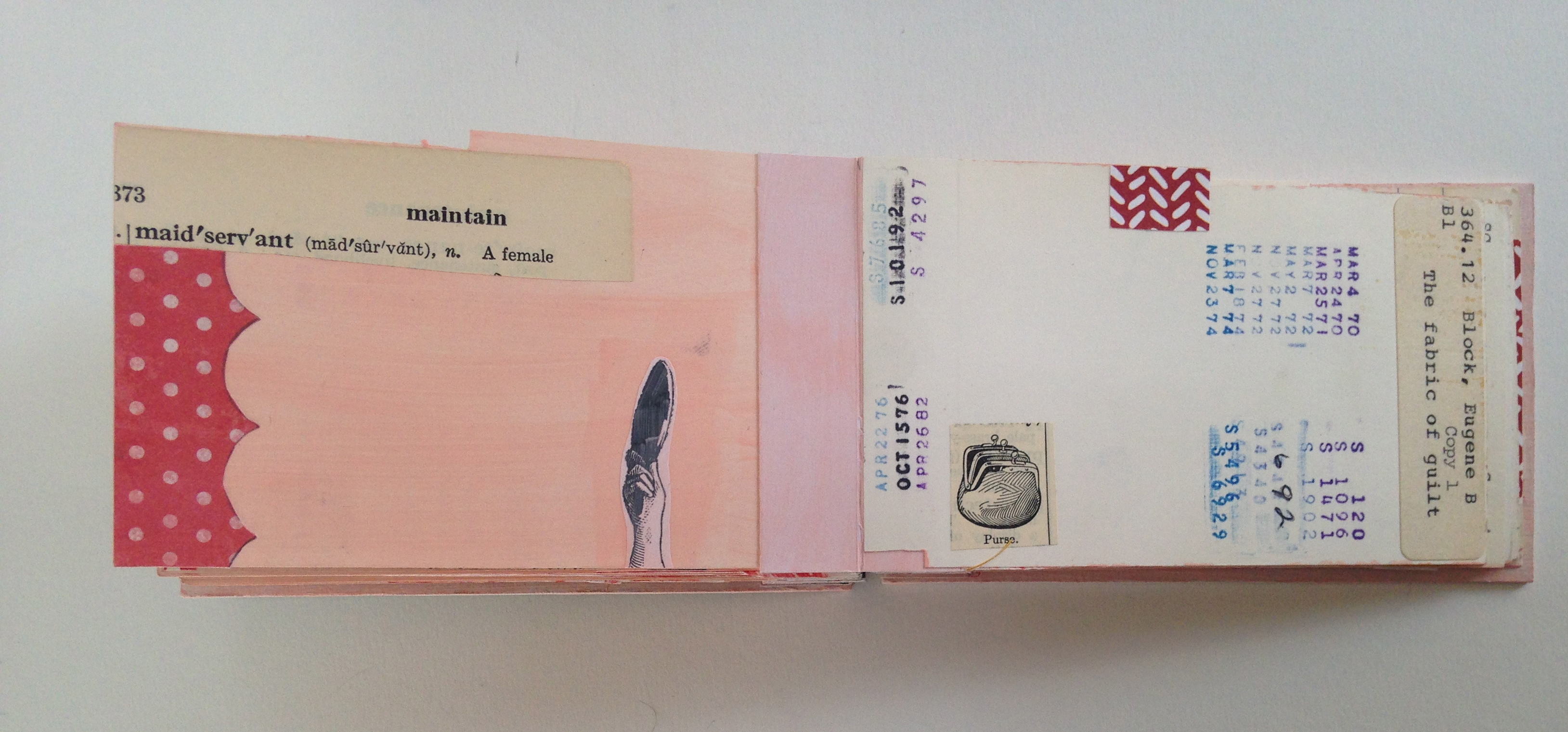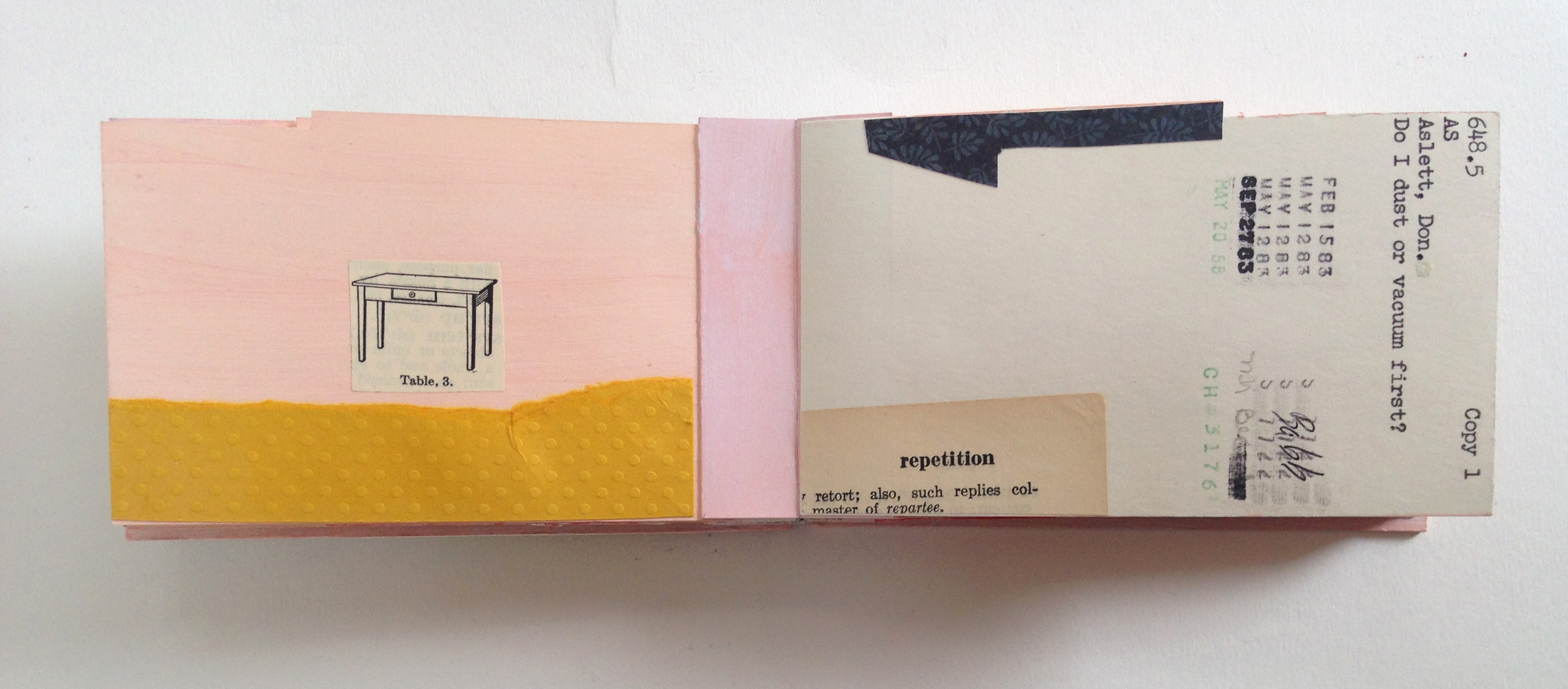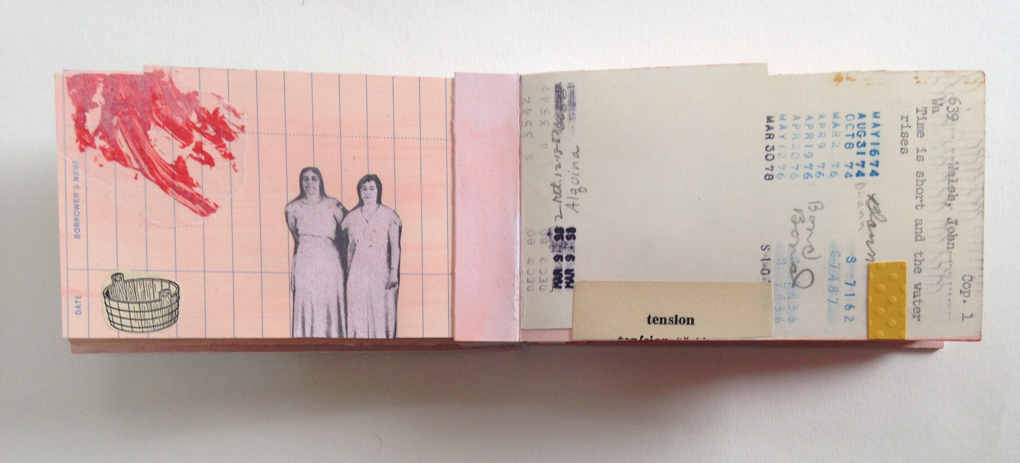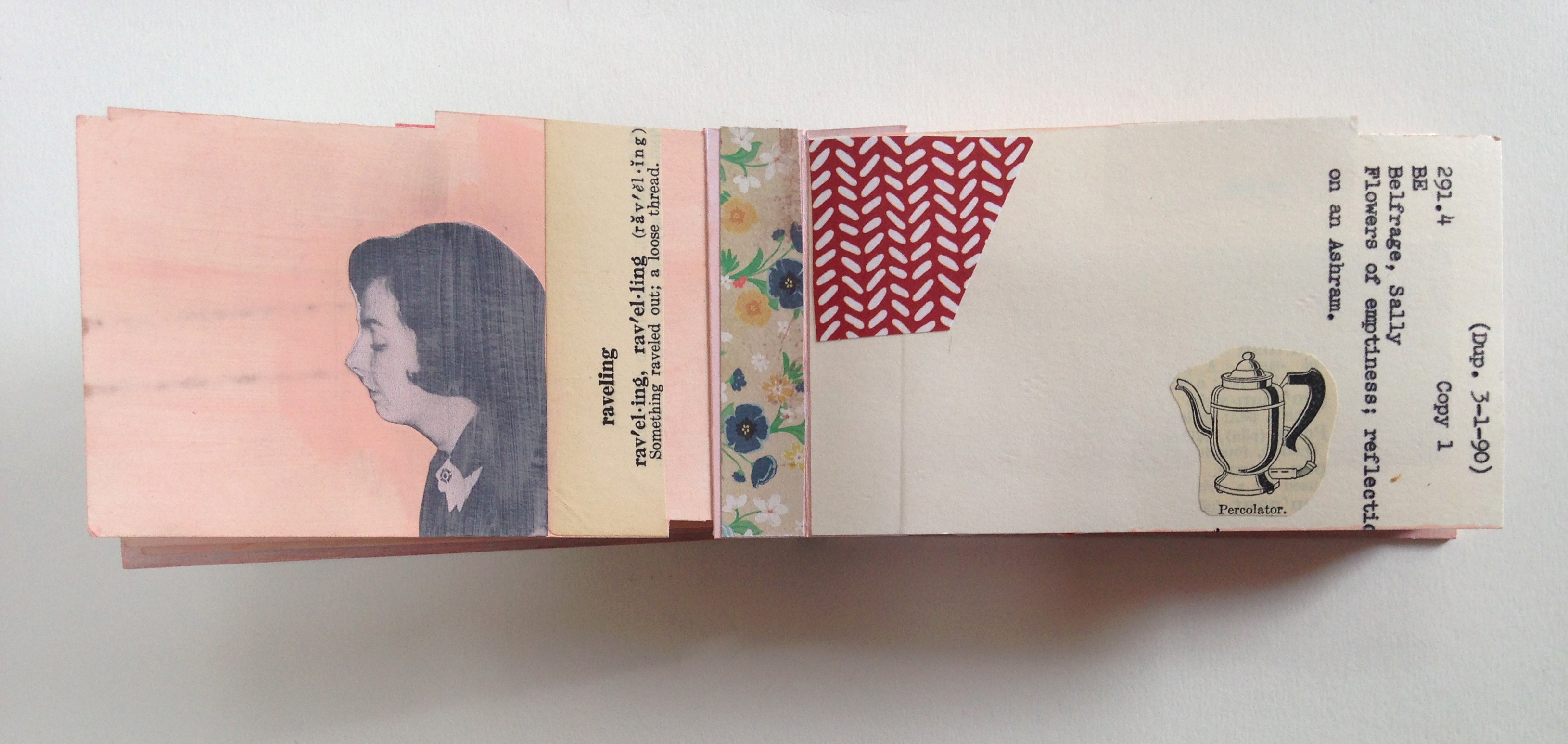 The Take Care Blues is a single row flag book made with 33 reclaimed library cards. I made this book in response to the overwhelming sadness that can accompany those who take care of homes, people, and relationships.