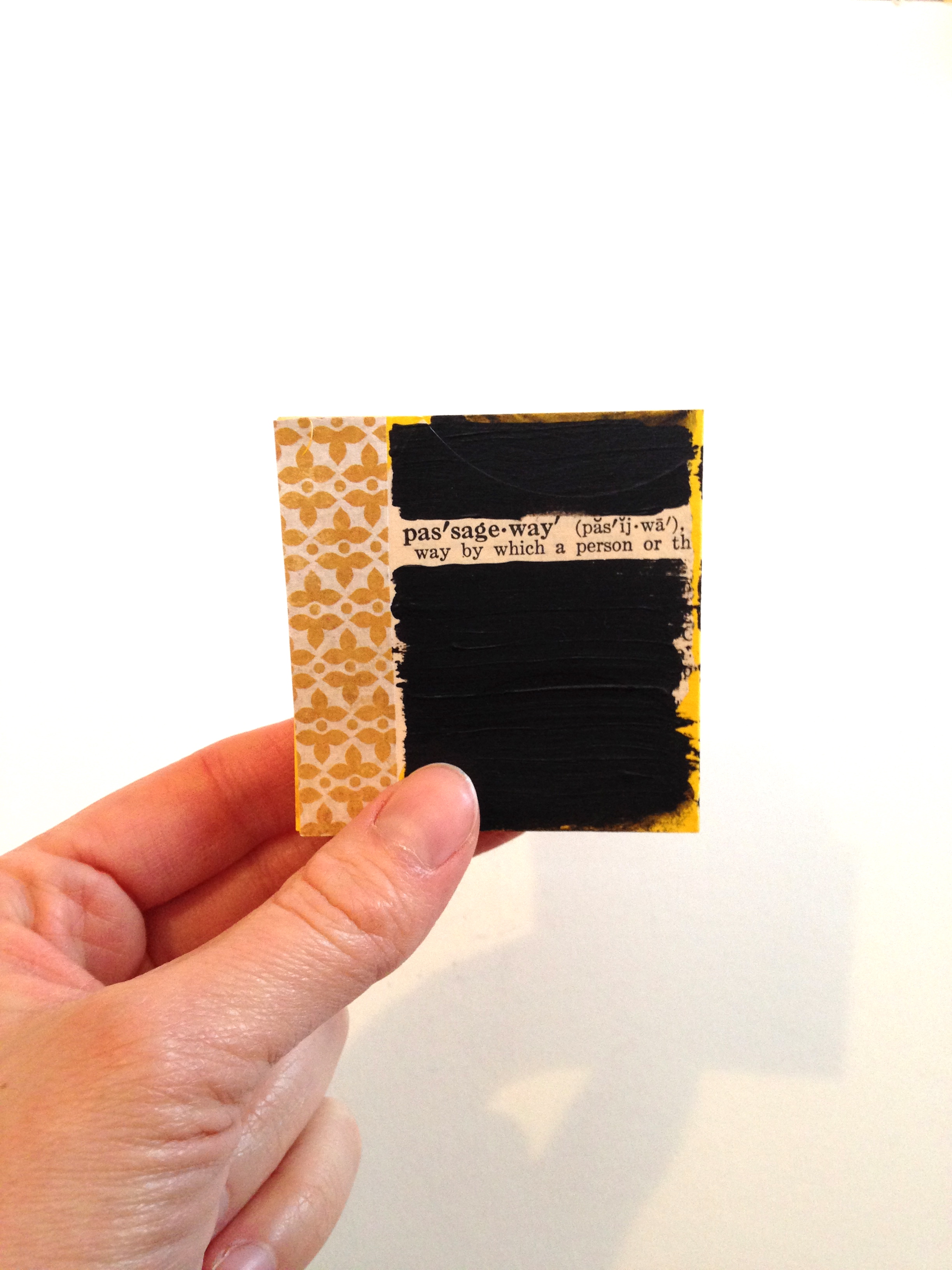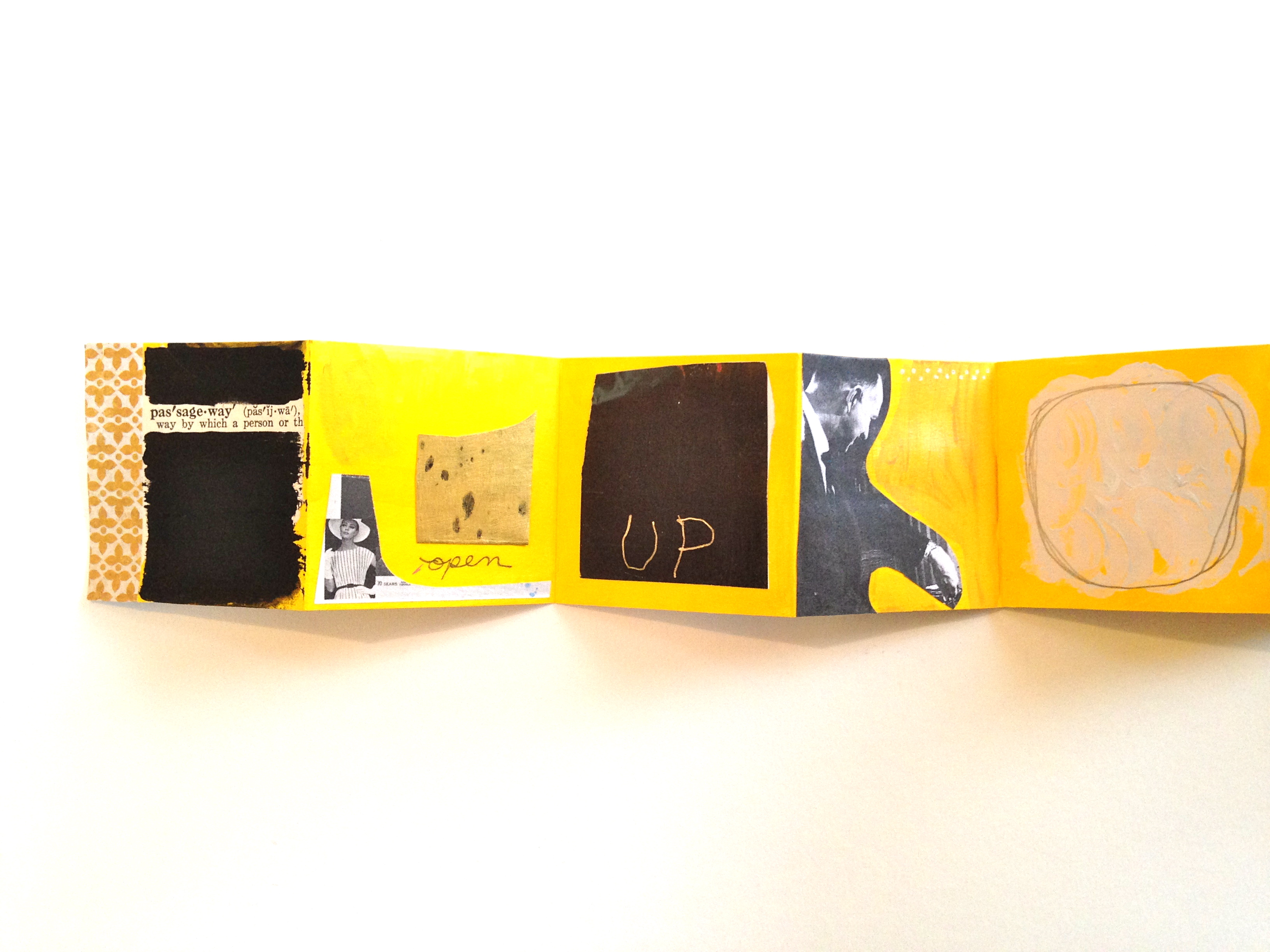 January 9, 2016 / 0 comments Passageway Passageway, 2.5″x2.5″x.5″, Accordion book, Acrylic paint, ink, pencil, decorative paper & collage, 2016. Share this: Click to share on X (Opens in new window) X Click to share on Facebook (Opens in new window) Facebook Click to email a link to a friend (Opens in new window) Email Click to share on Pinterest (Opens in new window) Pinterest Like Loading...