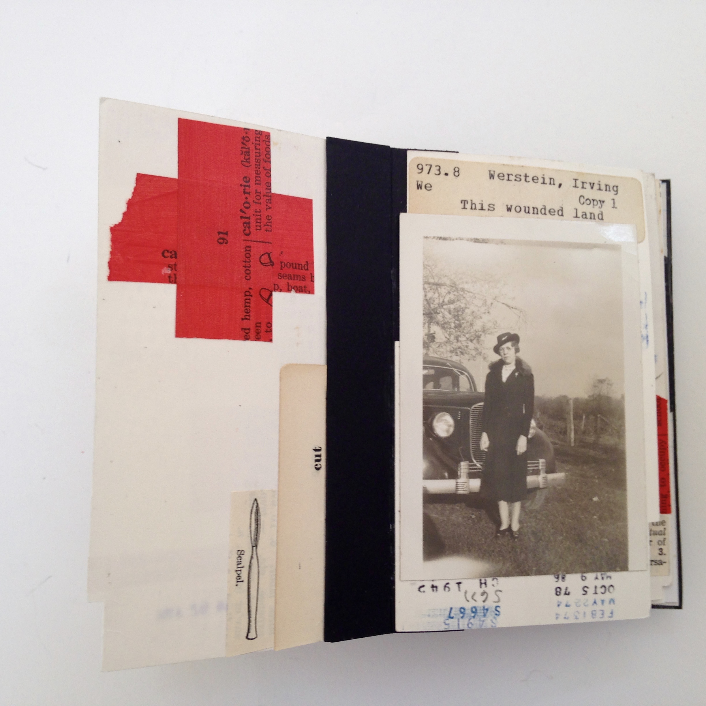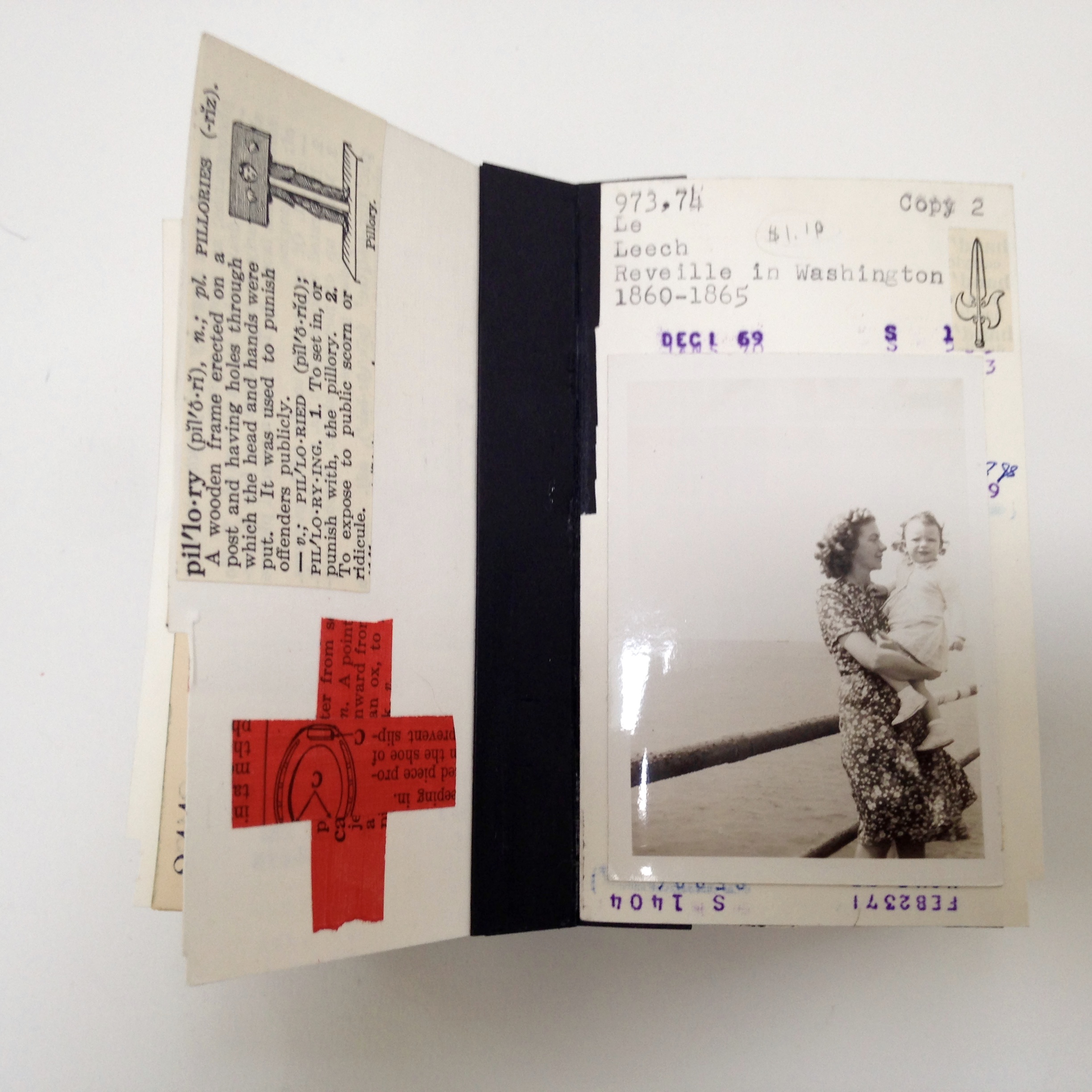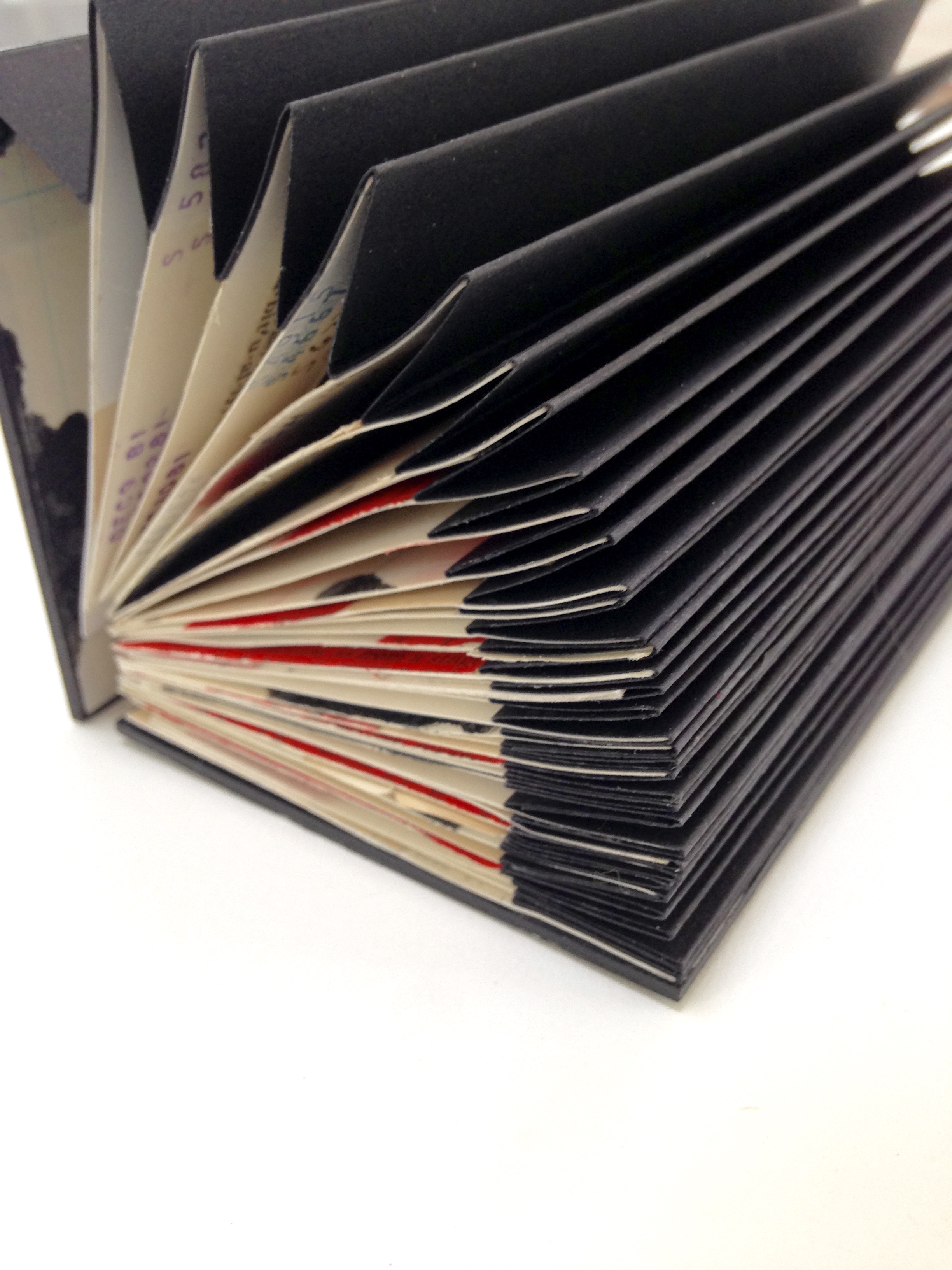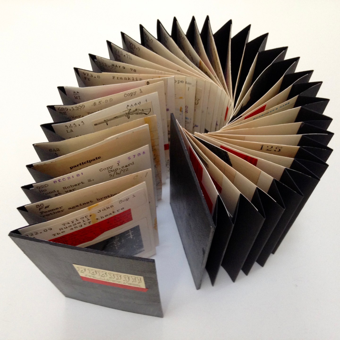 Tooth and Nail, Book measures 3″x5″x1.5″ when closed, 5″x41″ when opened, Flag book binding, Reclaimed library cards, acrylic, old photographs, found images, 2016