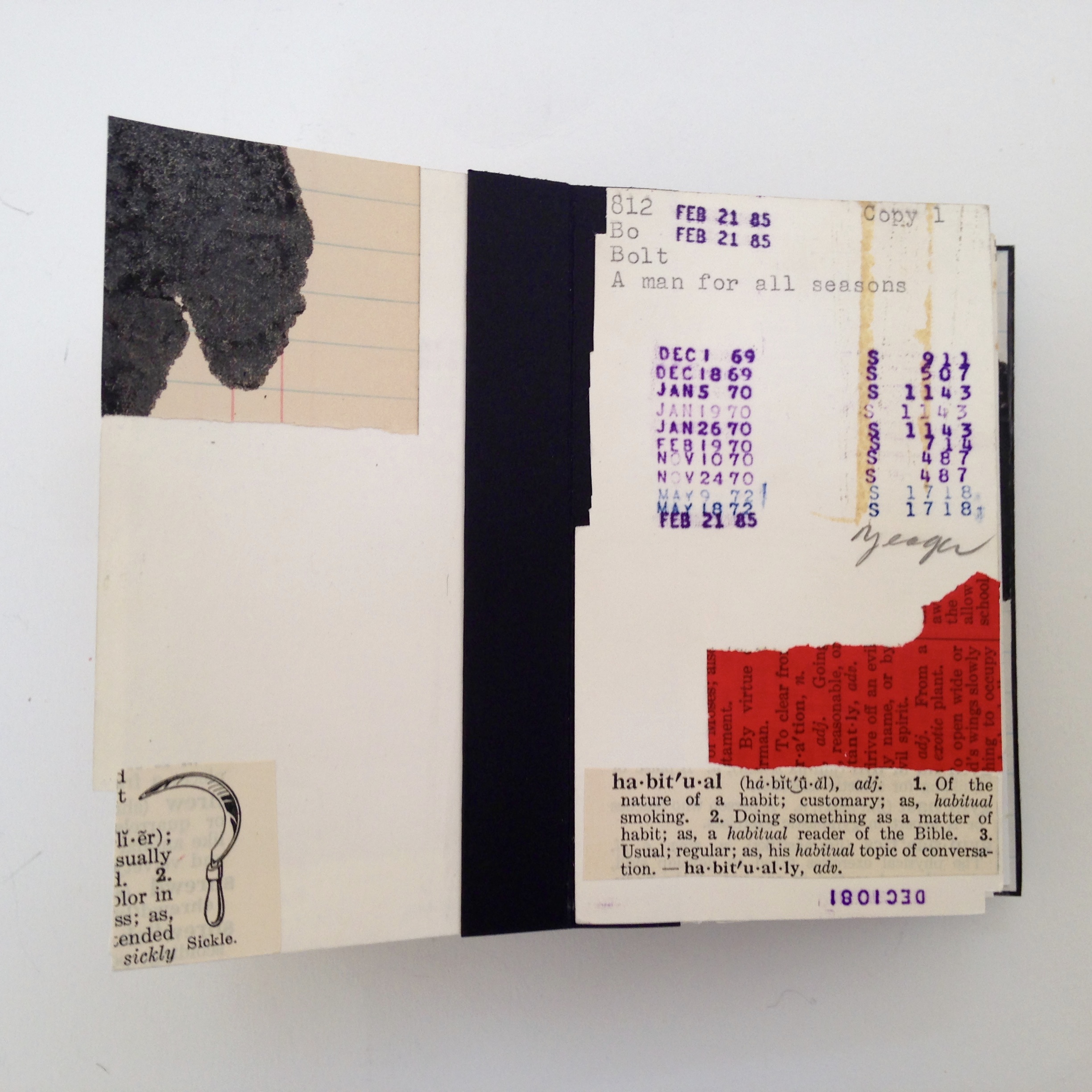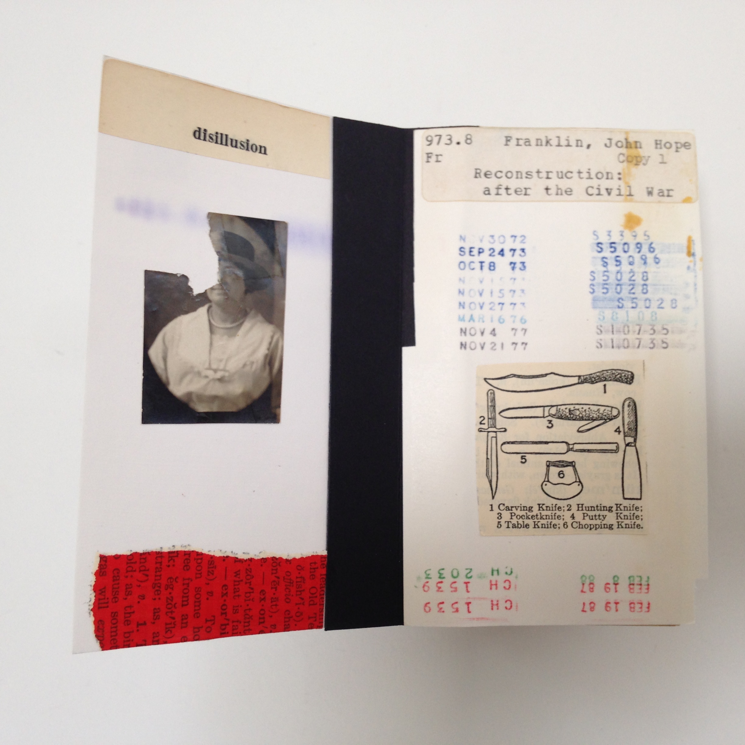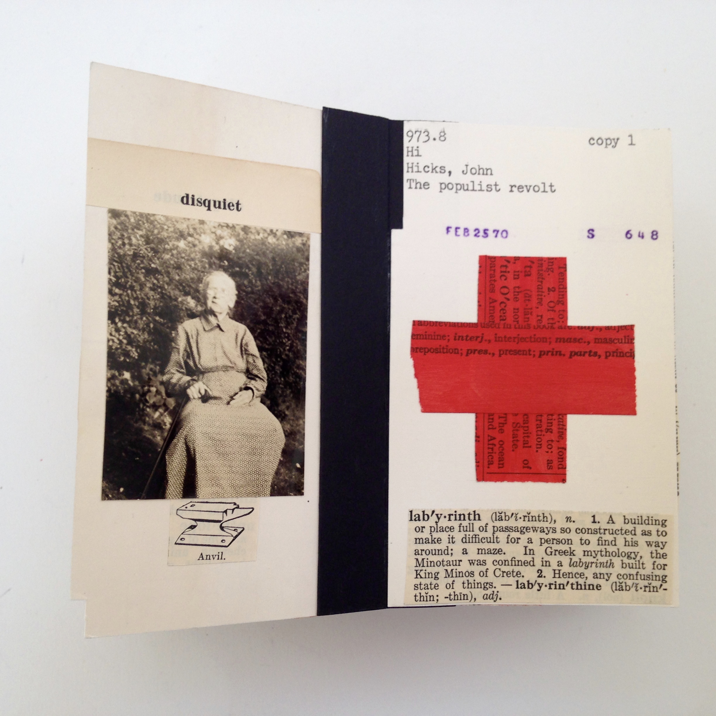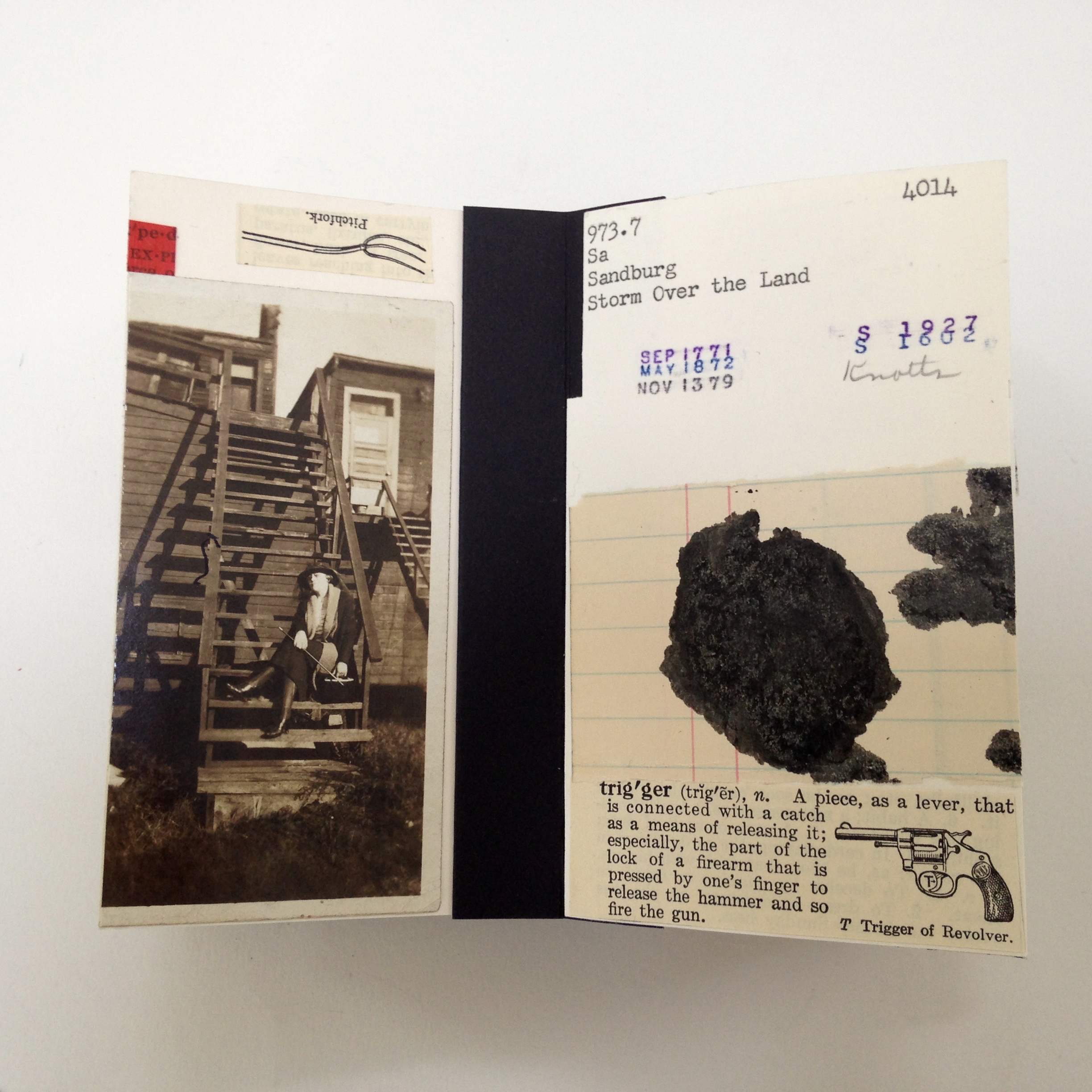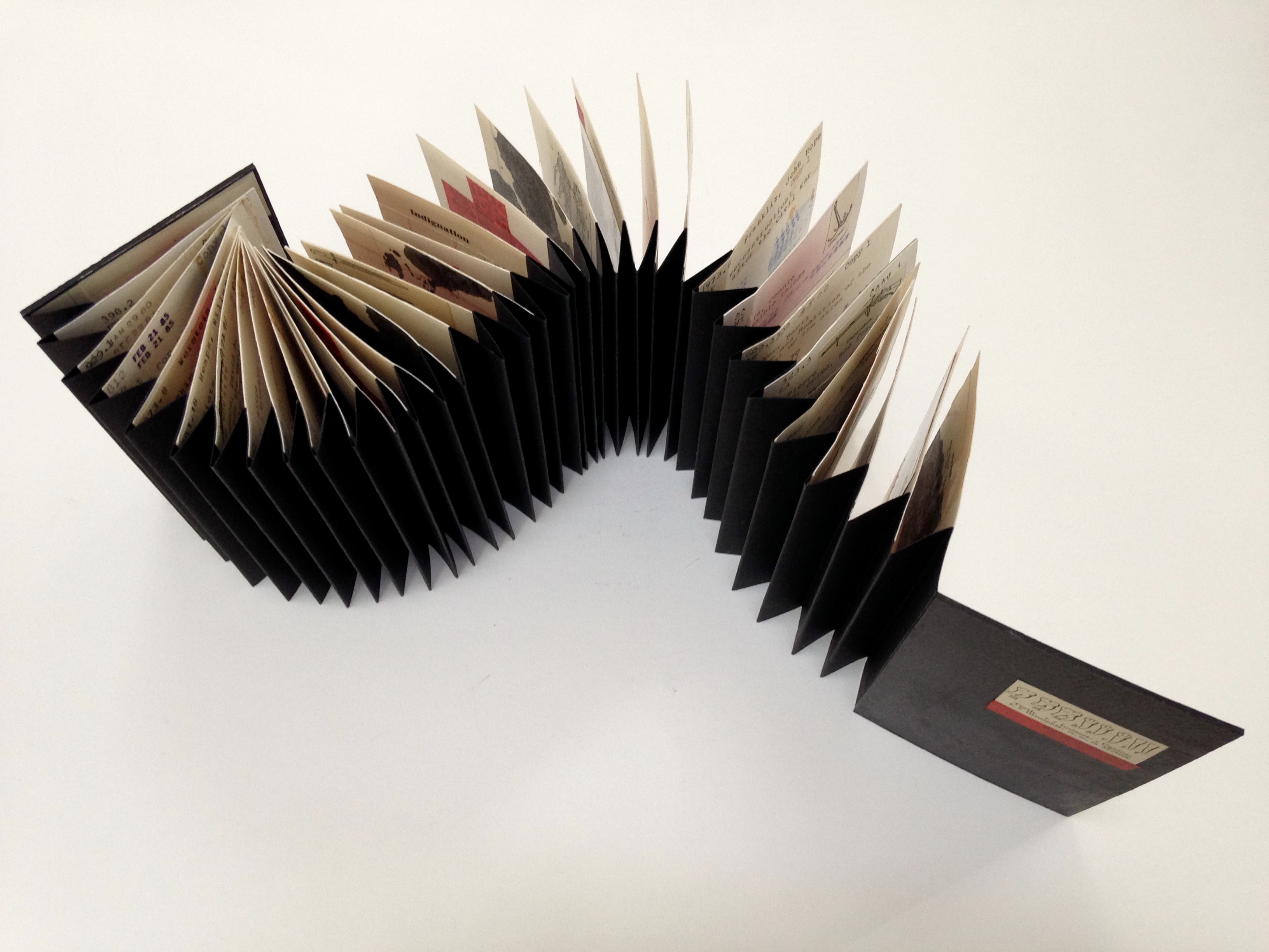 Tooth and Nail, Book measures 3″x5″x1.5″ when closed, 5″x41″ when opened, Flag book binding, Reclaimed library cards, acrylic, old photographs, found images, 2016