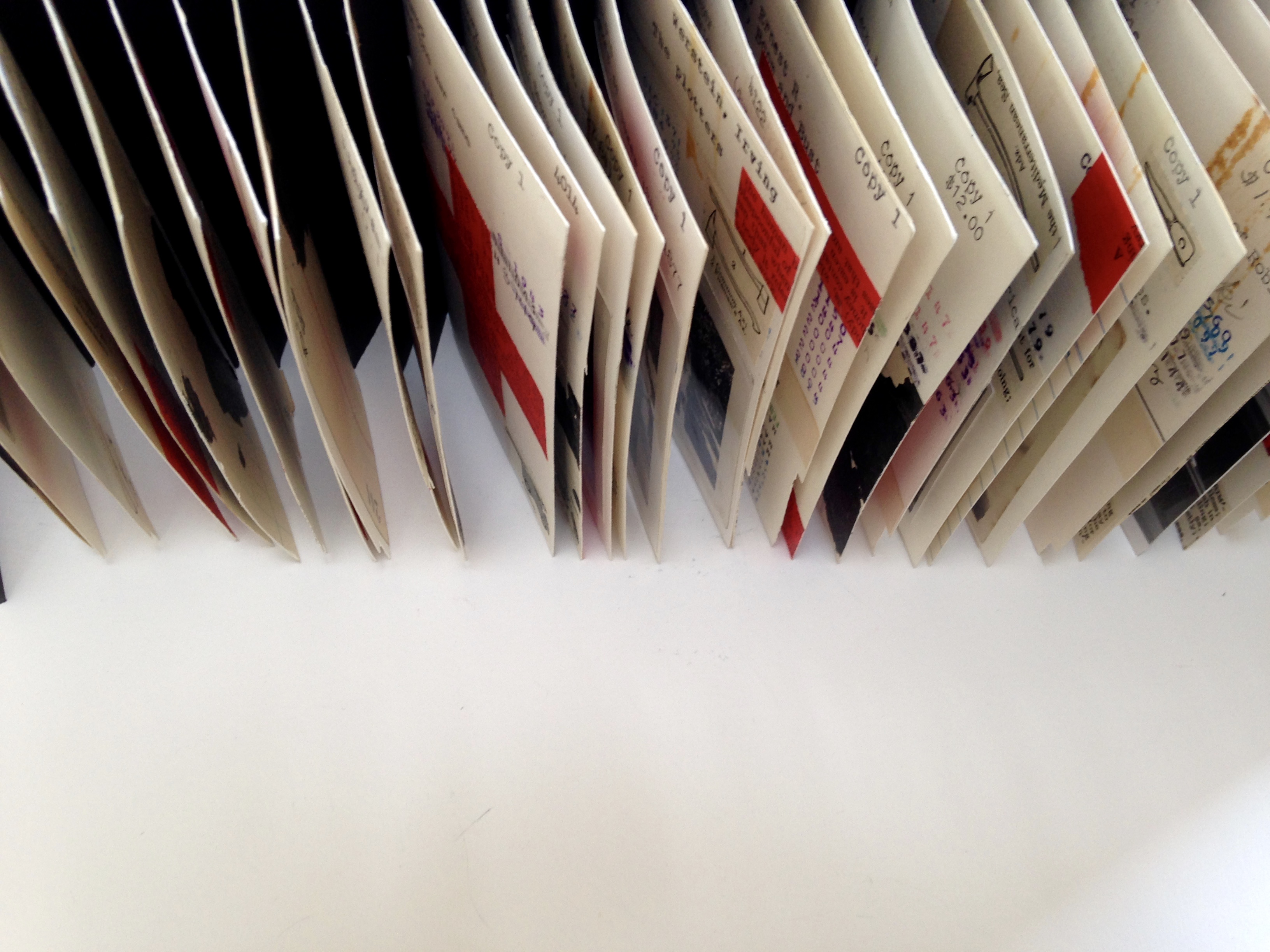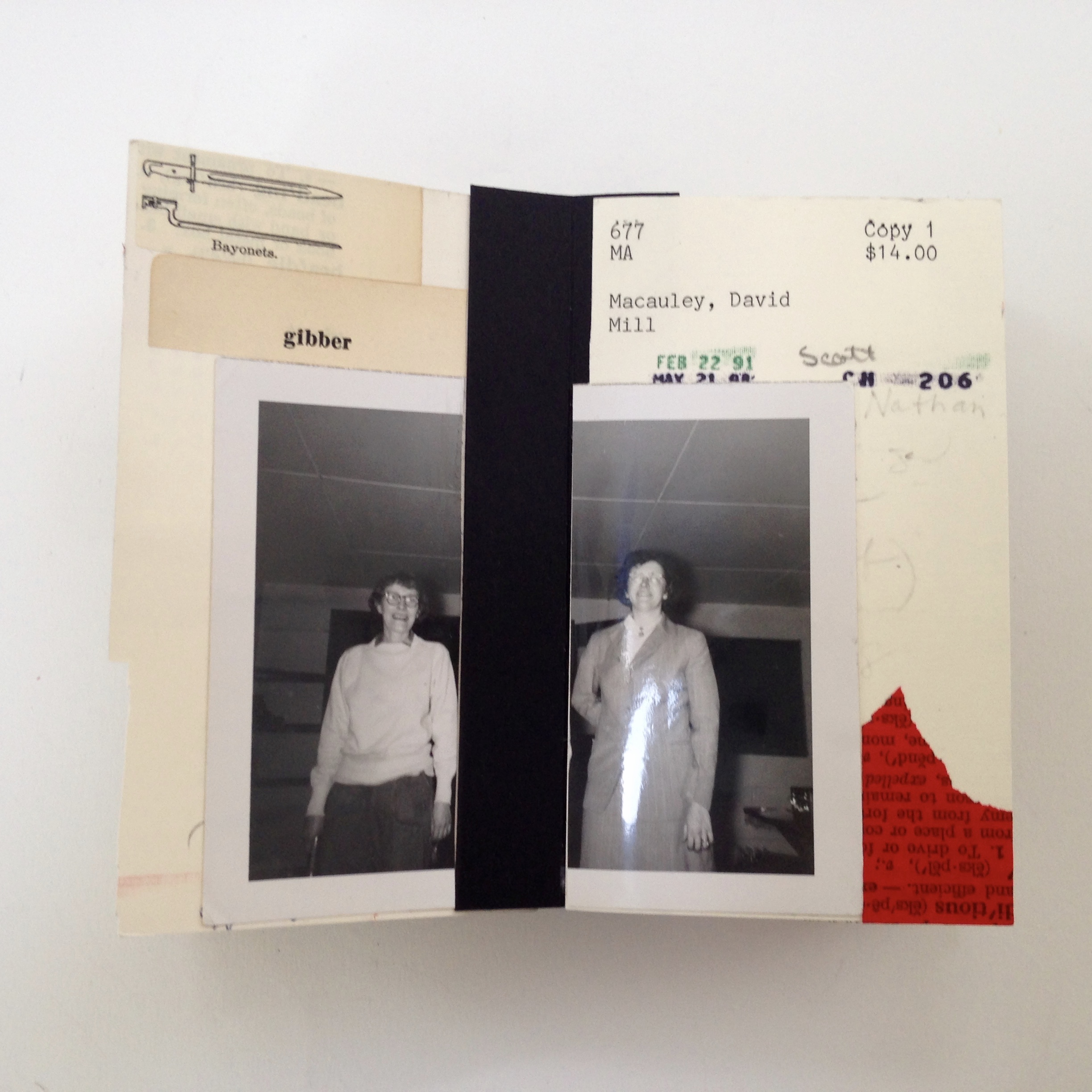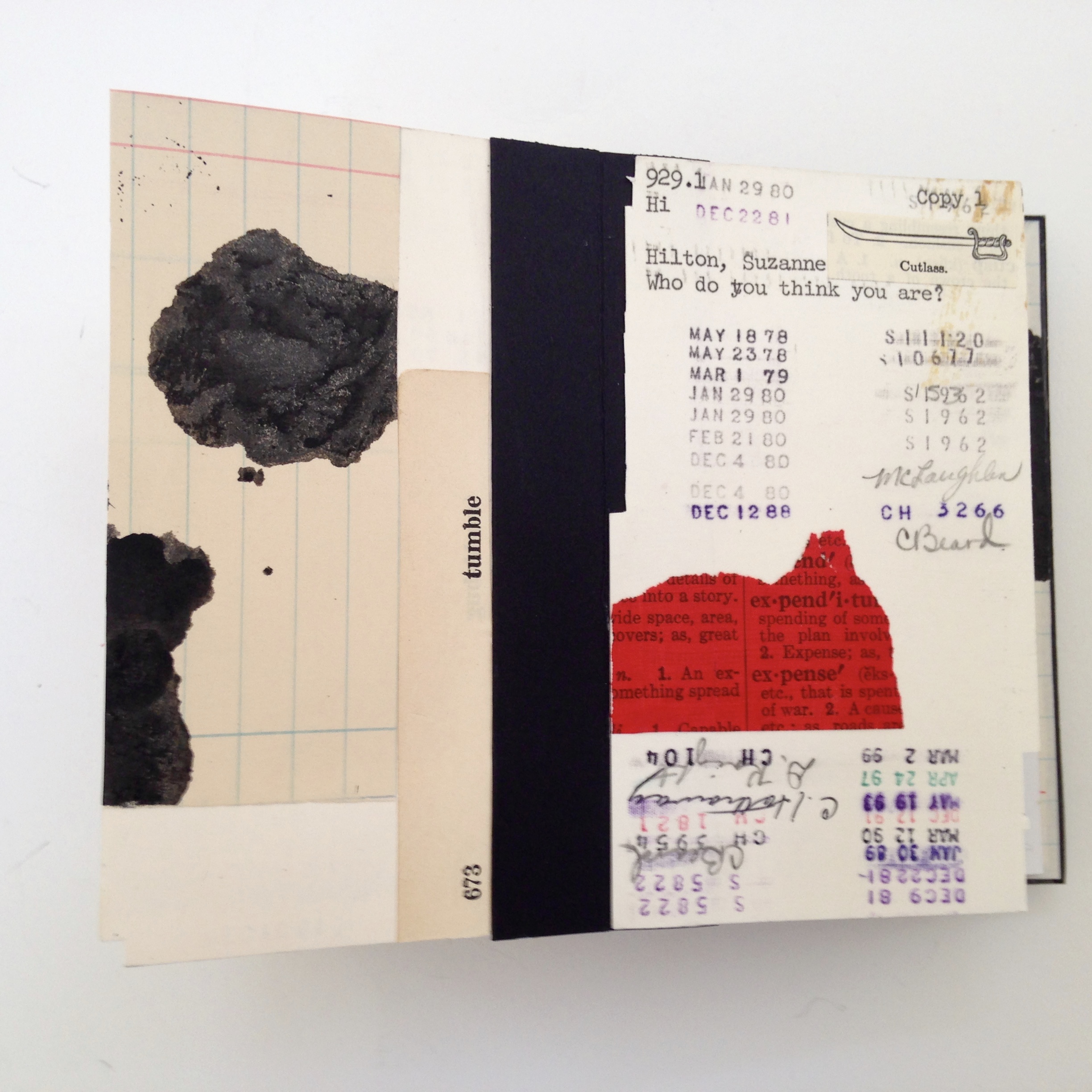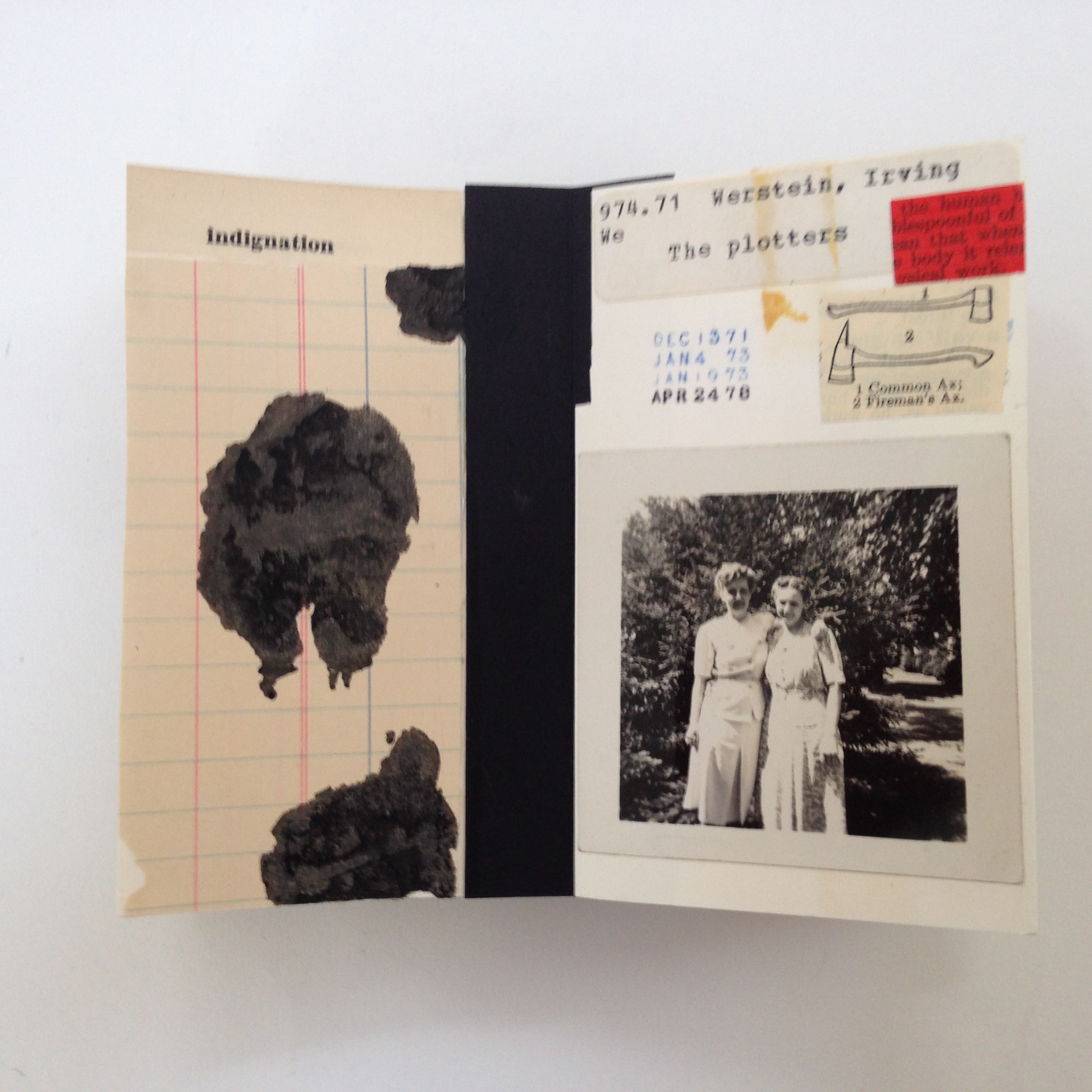 Tooth and Nail, Book measures 3″x5″x1.5″ when closed, 5″x41″ when opened, Flag book binding, Reclaimed library cards, acrylic, old photographs, found images, 2016